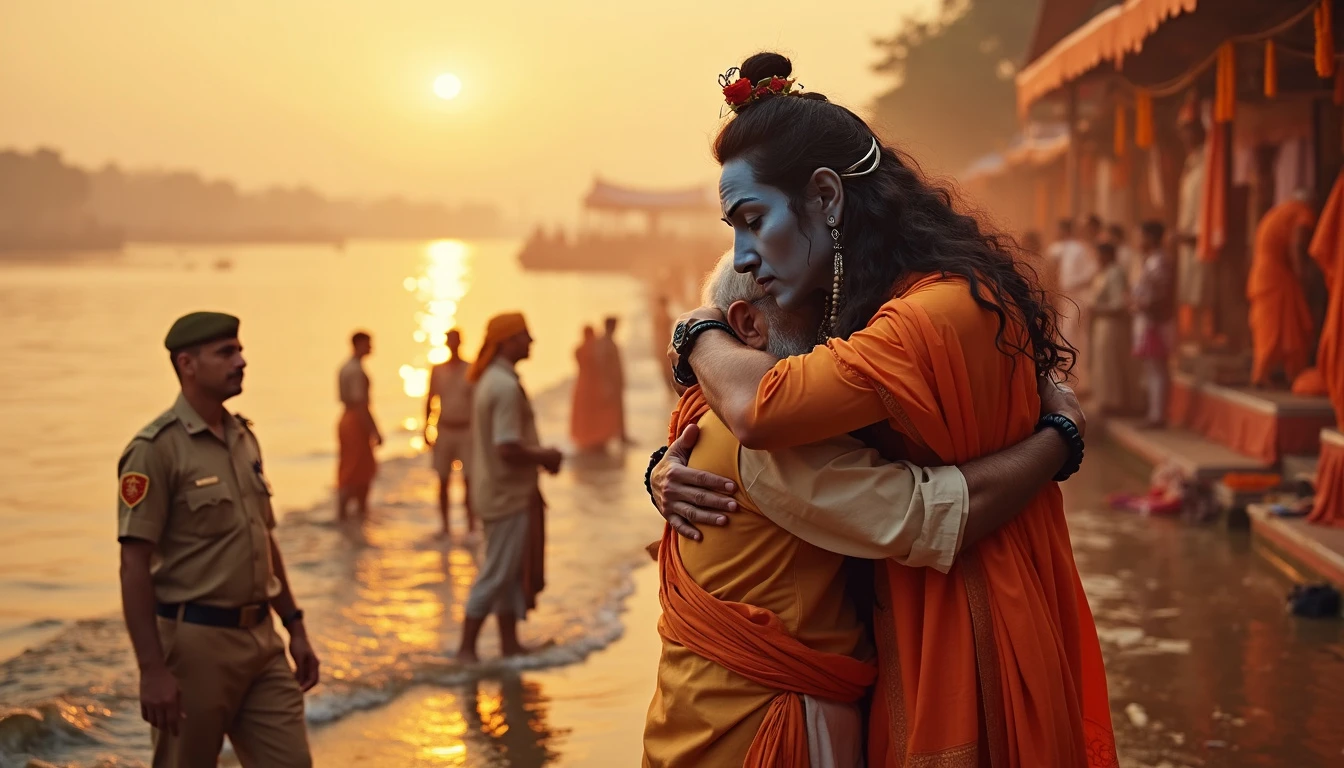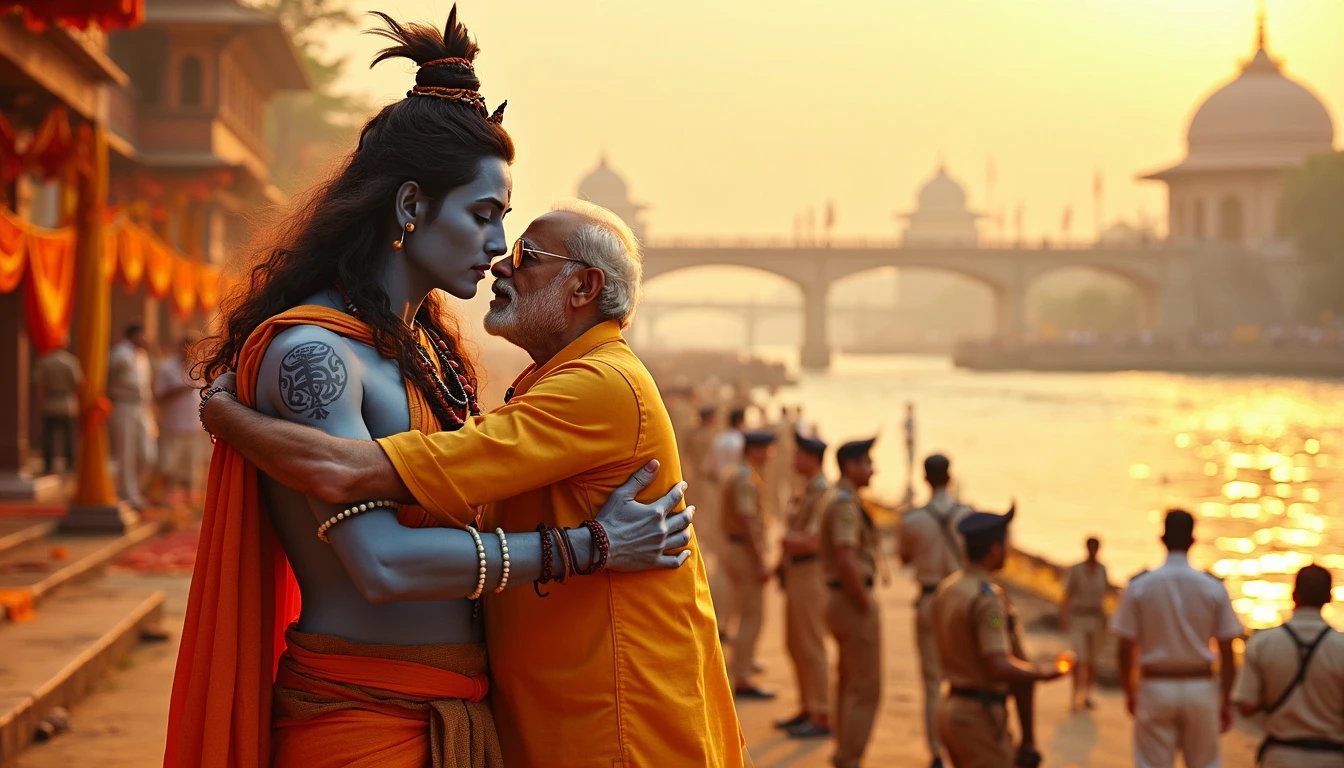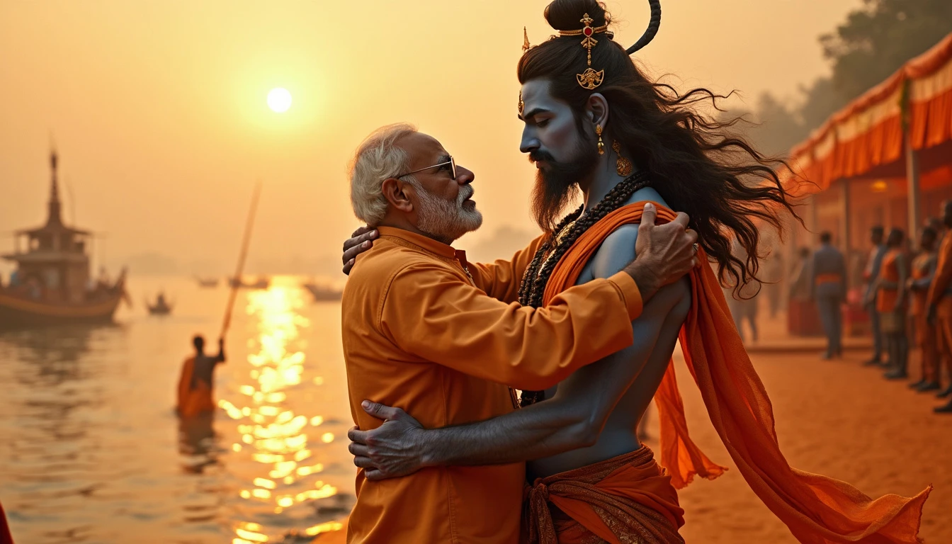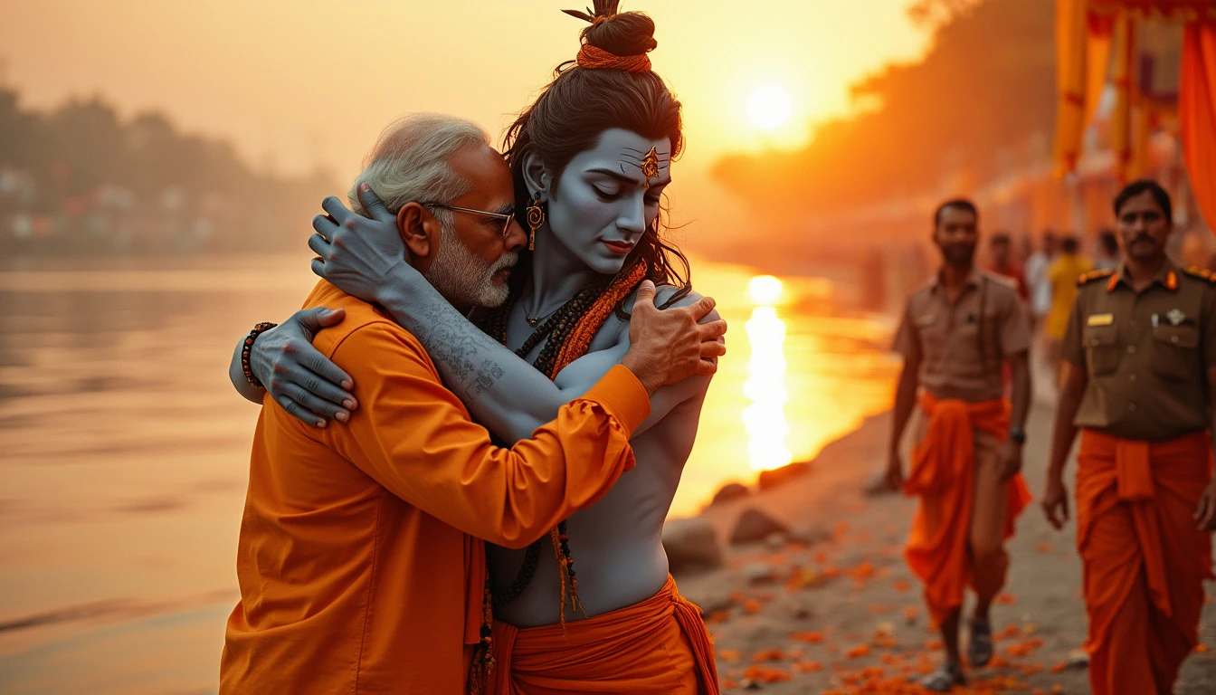 Visualize a powerful and spiritually charged scene on the banks of the Ganges River, where Indian Prime Minister Narendra Modi is embracing the divine form of Lord Shiva himself, rendered in a realistic and majestic manner. Modi, dressed in traditional saffron-colored attire—kurta and dhoti—shows deep reverence and connection as he wraps his arms around the divine form of Shiva. Lord Shiva appears in his divine, realistic form, radiant and majestic, with flowing hair adorned with sacred symbols and a serene expression. His form is both awe-inspiring and benevolent, embodying the essence of divine grace. The serene Ganges River flows gently in the background, reflecting the golden light of the setting sun and adding a warm, vibrant glow to the scene. The riverbank is adorned with saffron-themed decorations and traditional motifs, enhancing the overall spiritual ambiance. In the scene, a team of Special Protection Group (SPG) personnel is positioned discreetly around, ensuring security while maintaining a respectful distance. They wear their standard dark uniforms, contrasting with the vibrant colors of the setting. The entire setting radiates spiritual energy and reverence, with the vibrant saffron tones and natural beauty of the riverbank creating a sacred and celebratory atmosphere.