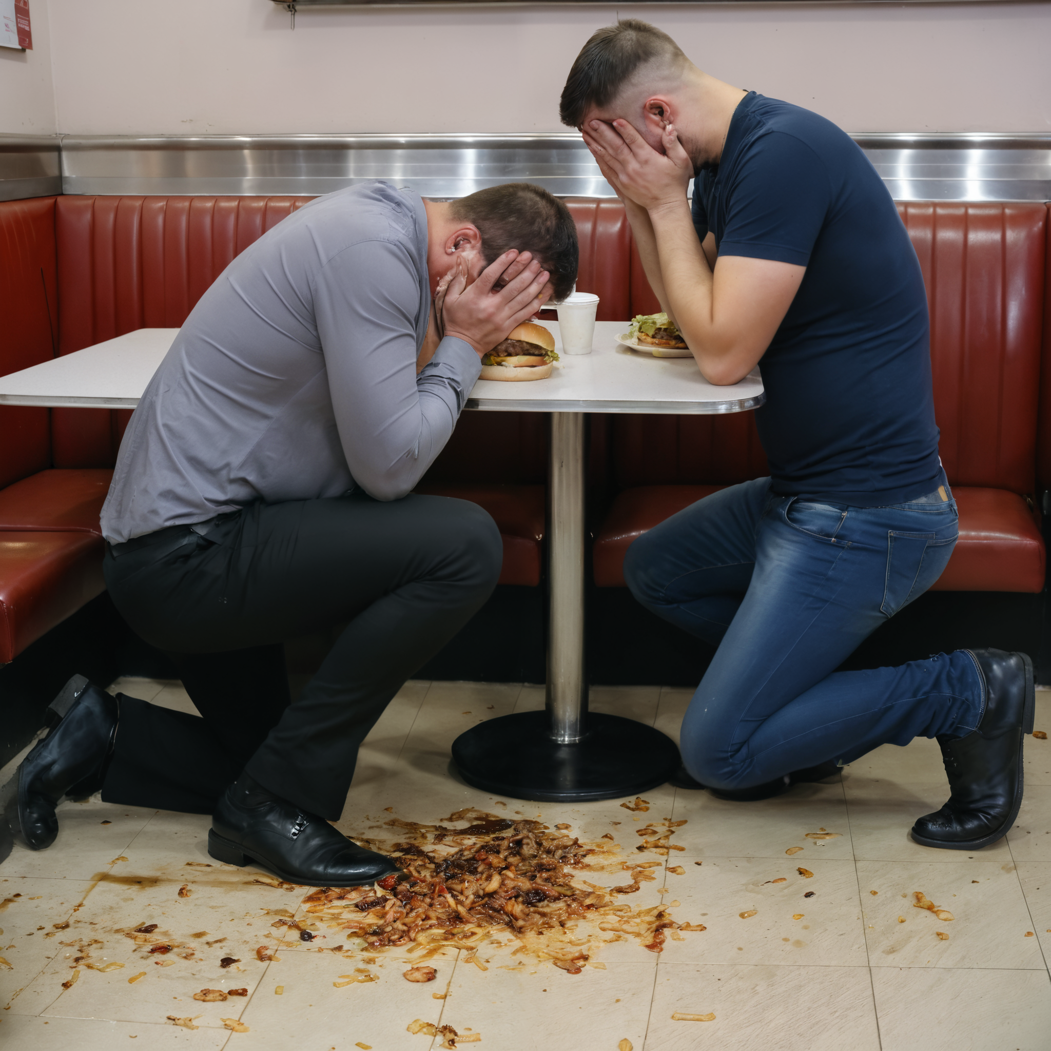 Funny pictures in a burger shop two men knelt. Crying out in excruciating pain His face was filled with sadness. There were food scraps scattered on the floor and table. motion blur, high-resolution, fine detail, appropriate details, 4k,
