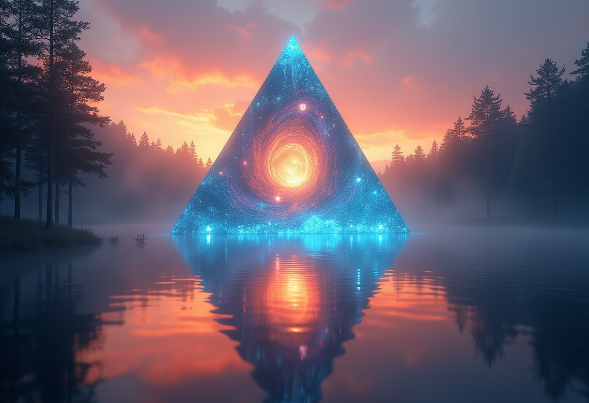 A massive, crystalline pyramid floating above a calm, mirrored lake at twilight. The pyramid is filled with a swirling aurora of colors, reflecting the setting sun’s golden rays. Tiny, luminous orbs drift inside, like stars caught in a celestial current. Beneath the pyramid, the lake’s surface shimmers, reflecting the vibrant hues of the sky. Around the lake, tall, shadowy trees stand silent, their reflections merging with the scene. The air is thick with a gentle mist, adding an ethereal, dreamlike quality. Ultra-detailed, 4K, with a serene yet mystical atmosphere