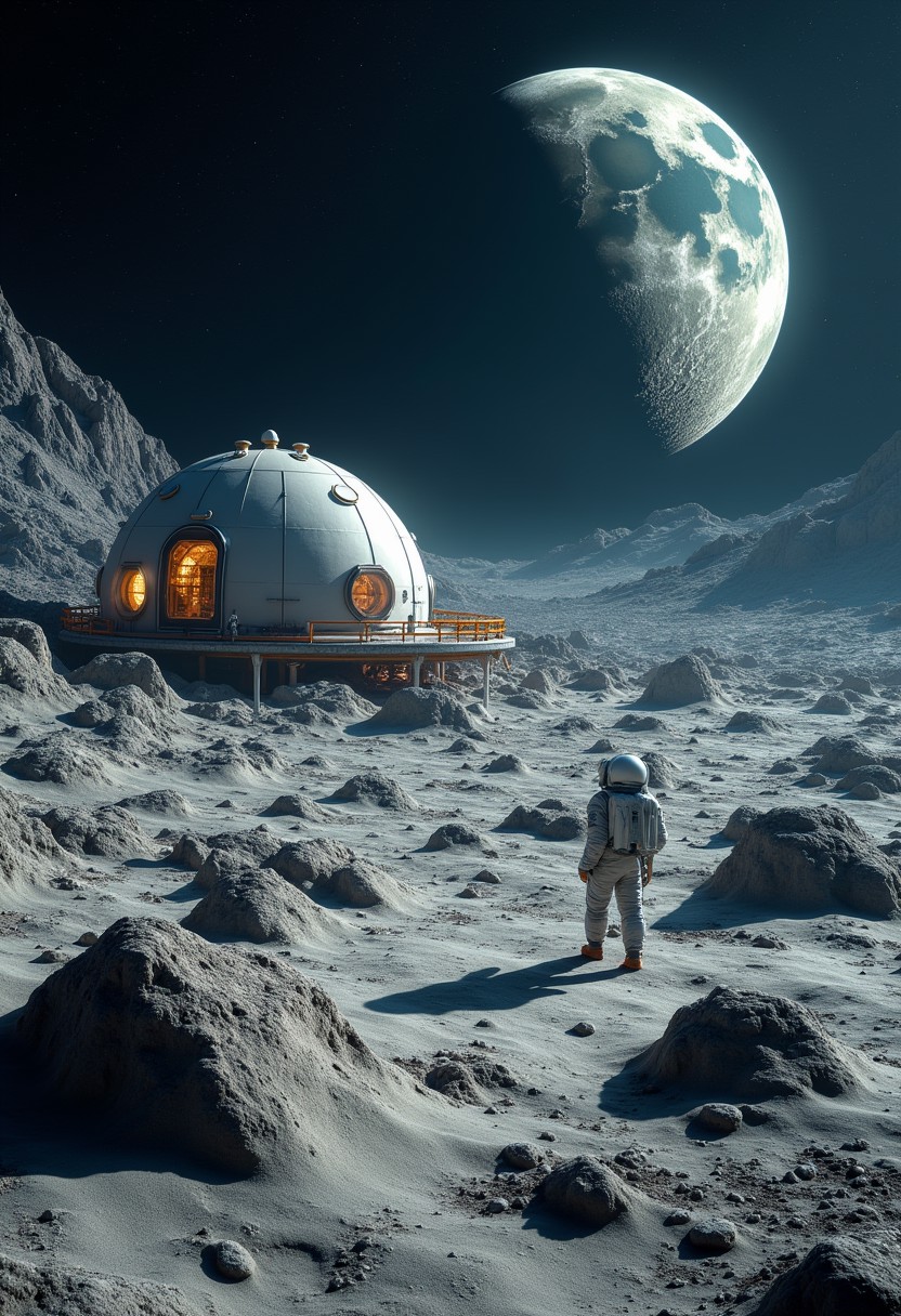 8K, insane details, A speculative but artistically rendered photograph imagines a hidden moon base on the far side of the Moon, obscured from Earth's view. The image depicts domed habitats and solar arrays nestled within rugged lunar terrain, with Earth hanging low on the horizon. Astronauts in spacesuits conduct scientific experiments amidst the stark lunar landscape, underscoring humanity's exploration and colonization aspirations beyond Earth. The photograph is crafted with digital compositing techniques to blend realism with futuristic imagination.