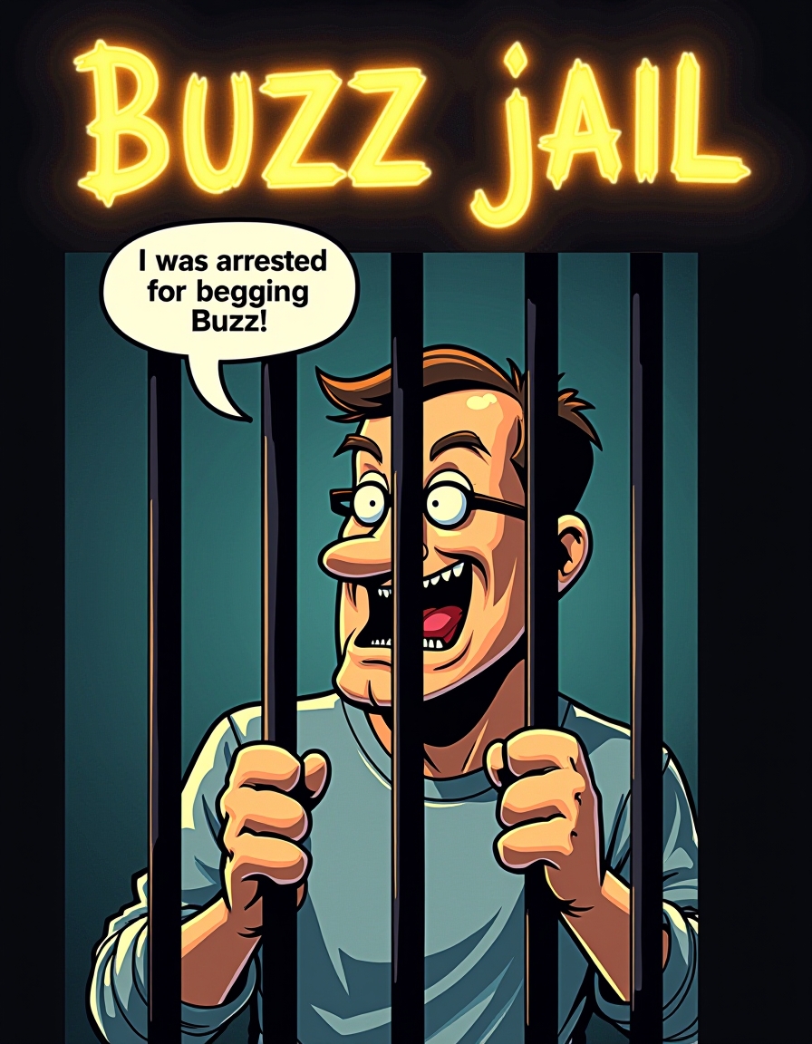 man behind prison bars says in speech bubble "I was arrested for begging Buzz" , at top of image text "Buzz jail" written with electrified yellow letters