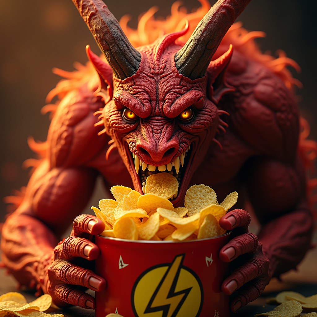 Flux demon eating chips, buzz inscription on the bag of chips,the chips is a shape of yellow lightning icon,movie poster, photorealistic, high-quality, highly detailed