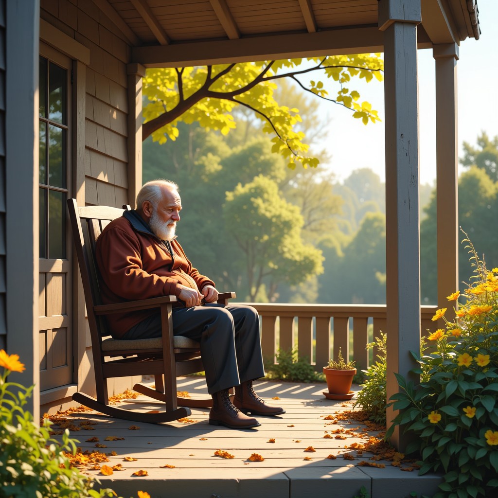 an old man sits on a rocking chair on his porch,TzigoAnimeStyle