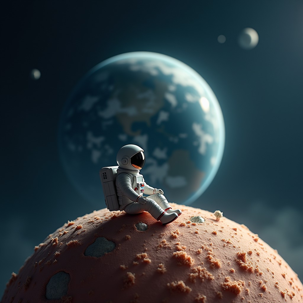 An astronaut sitting on a miniature planet, in space, looking at the earth.