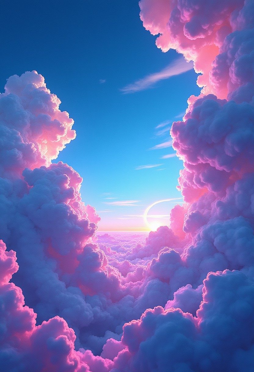 (masterpiece, best quality:1.5), A surreal, ultra-high definition (UHD) skyscape featuring a nephogram of swirling, vibrant clouds in a cloudpunk aesthetic. The clouds are depicted with bold, sharp lines, forming intricate, hyper-detailed patterns across the sky. The color palette is vivid and intense, with electric blues, neon pinks, and glowing purples blending together, creating an otherworldly atmosphere. The scene captures the immense scale of the sky, with the clouds twisting and turning in surreal, impossible shapes, illuminated by a strange, ethereal light. The overall effect is a mesmerizing, dreamlike landscape that feels both fantastical and tangible. Complex composition with micro-details.
