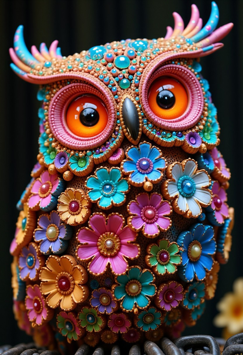 PSYCHEDELIC dramatic dynamic portrait of a fractal owl with cartoon eyes covered in intricate glowing colorful floral bioluminescent ivy filigree and glowing glass beads, chestnut scarlet canary pumpkin ivory mahogany aquamarine raspberry, in the style of Salvador Dali and Disney, 4k, cinematic lightihng