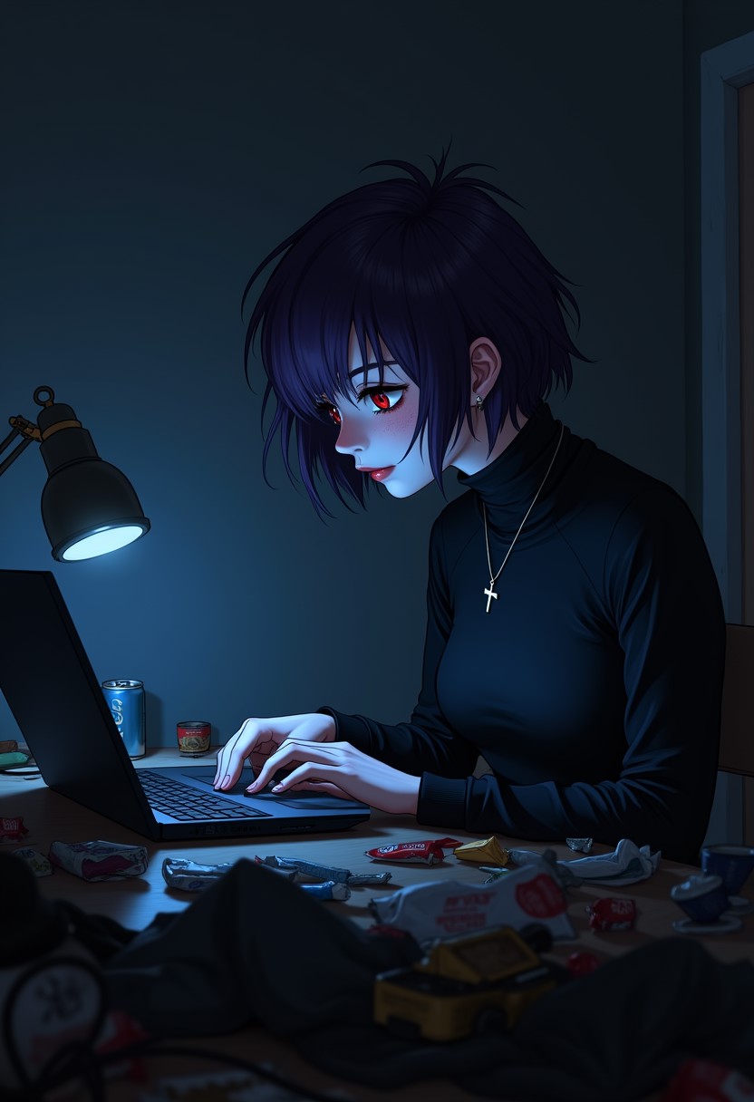 In the dimly lit room, the young woman with tan skin sits at her cluttered desk, absorbed in the glow of her laptop screen. She’s wearing a black turtleneck with a small, silver cross hanging at her collar, its simplicity contrasting with the disarray around her. Her short purple hair is messy, strands sticking out in every direction as if she’s long given up on taming it. Her red eyes appear dull and unfocused as they fixate on the screen in front of her. There’s a hint of dark circles beneath them. Her posture is slouched, almost lazily leaning forward, one hand half-heartedly resting on the keyboard, the other aimlessly clicking or scrolling. The room reflects her apathy—empty snack wrappers, discarded cans, and clothes are strewn about carelessly, adding to the sense of neglect. The dim light from a solitary desk lamp barely illuminates the room, casting long shadows that stretch across the floor and walls. The only other source of light is the faint blue glow from her laptop, reflecting off her skin and creating an eerie contrast with the darkness around her. The screen reflects in her dull eyes, showing an endless scroll of social media, a random video, or perhaps a pointless game. rotting there in the dim light. The scene is a blend of apathy and quiet resignation, where the outside world doesn’t exist, and there’s no urgency to change a thing.