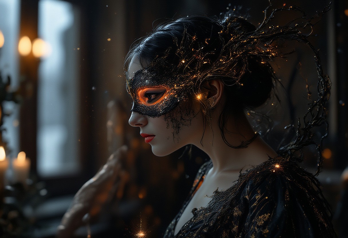 Cinematic style, realism, cinematic quality, Pastel, drawing with dry chalk, A vibrant, futuristic form with smooth curves and a golden sheen that created an otherworldly atmosphere. The night was thick with rain, its rhythmic drumbeats in the tall windows of the old manor mingling with the low hum of jazz drifting through the room. She moved through the crowd like smoke, dark and elusive, in a shimmering dress that seemed to catch the light in all the right places. Her (((mask of delicate black lace: 1.4))), clinging to her skin, revealed just enough to spark the imagination, but hid the most important parts: her eyes. Only her lips were open, painted a shade of red that seemed both dangerous and inviting, like a whispered secret. One that could kill a man. Simple yet captivating, the design caught the light reflections on its surface, adding depth and dimension. This digital work of art embodies modernity while simultaneously awakening curiosity about what lies beyond our consciousness.