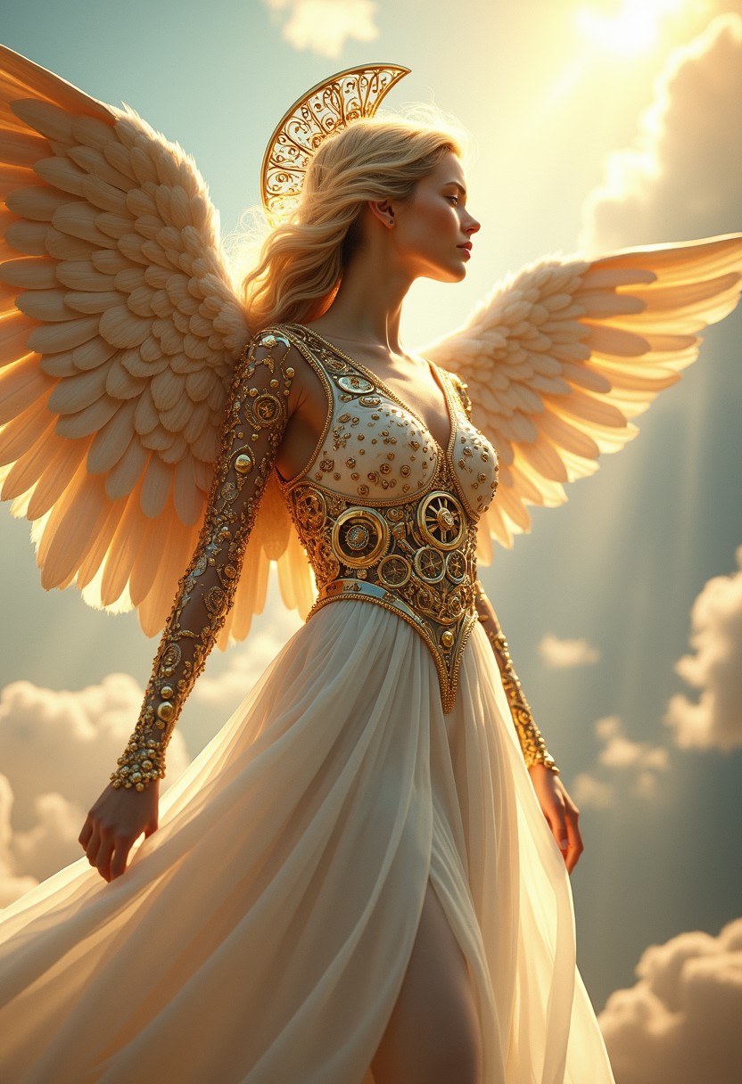 A masterpiece, surreal, elegant, seamlessly merging with a clockwork gold angel figure, flowing white dress transformed into polished silver gears and springs, interlocking with metallic precision, bright, warm golden luminescence, elaborate silver halo with intricate feather-like details, heavenly cloudscape backdrop with beams of sunlight and shimmering rainbows, intricate details, golden metallic sheen, white and golden elements, divine and ethereal, light angel queen, radiant beauty, celestial grace, 8k, hyperrealistic, soft focus