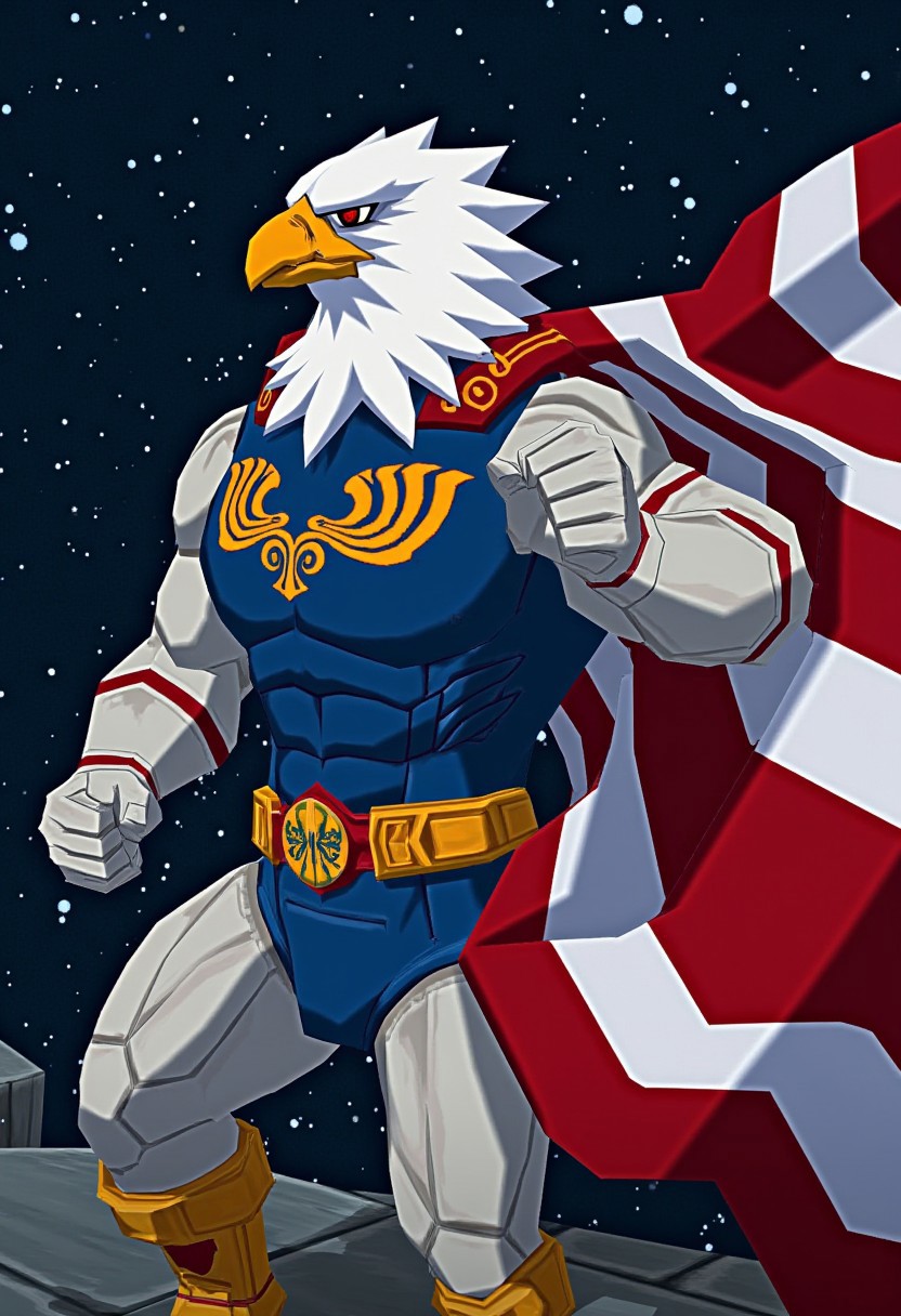 windwakerstyle, eagle superhero with united states flag cape, white feather body, white skin, flexing muscles. starry background