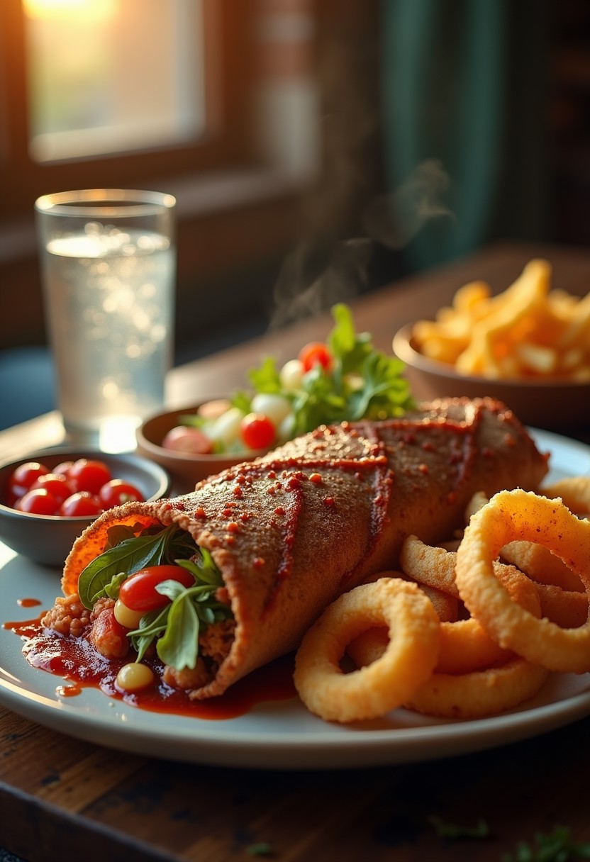 large serving plate, a fresh juicy shawarma rolled in taboon beard with salad inside, a side of vegetable salad, a side of fresh potato fries and onion rings, a glass of sparking water, dawn time, focus on food on the plate, steaming hot, Photorealistic, Highly detailed, masterpiece, 4k, high resulution, great lighting,