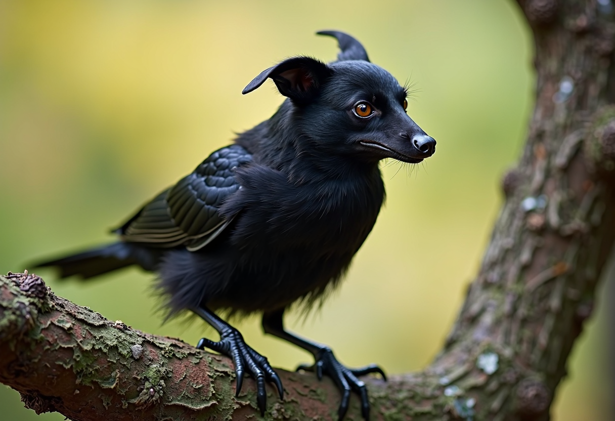 Hybrid between a blackbird merlon and a dog, the small, agile body of a blackbird with the head of a dog, perched on a tree branch, hyper-realistic, action scene, cinematic, perfect textures, tilt-shift effect.