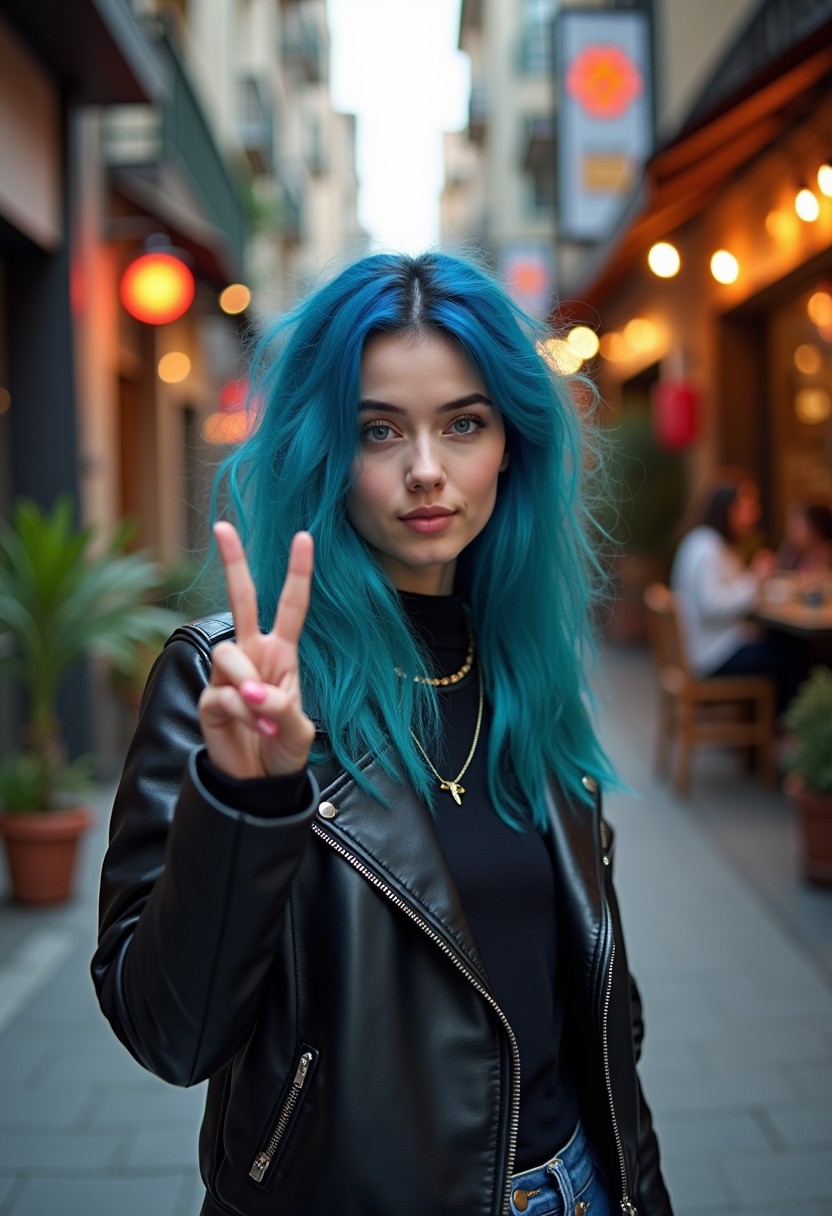 a beautiful grunge young woman with blue hair standing and posing for the camera. In the background is a trendy Alleyway cafe. The woman is giving the peace sign. Flash photography.