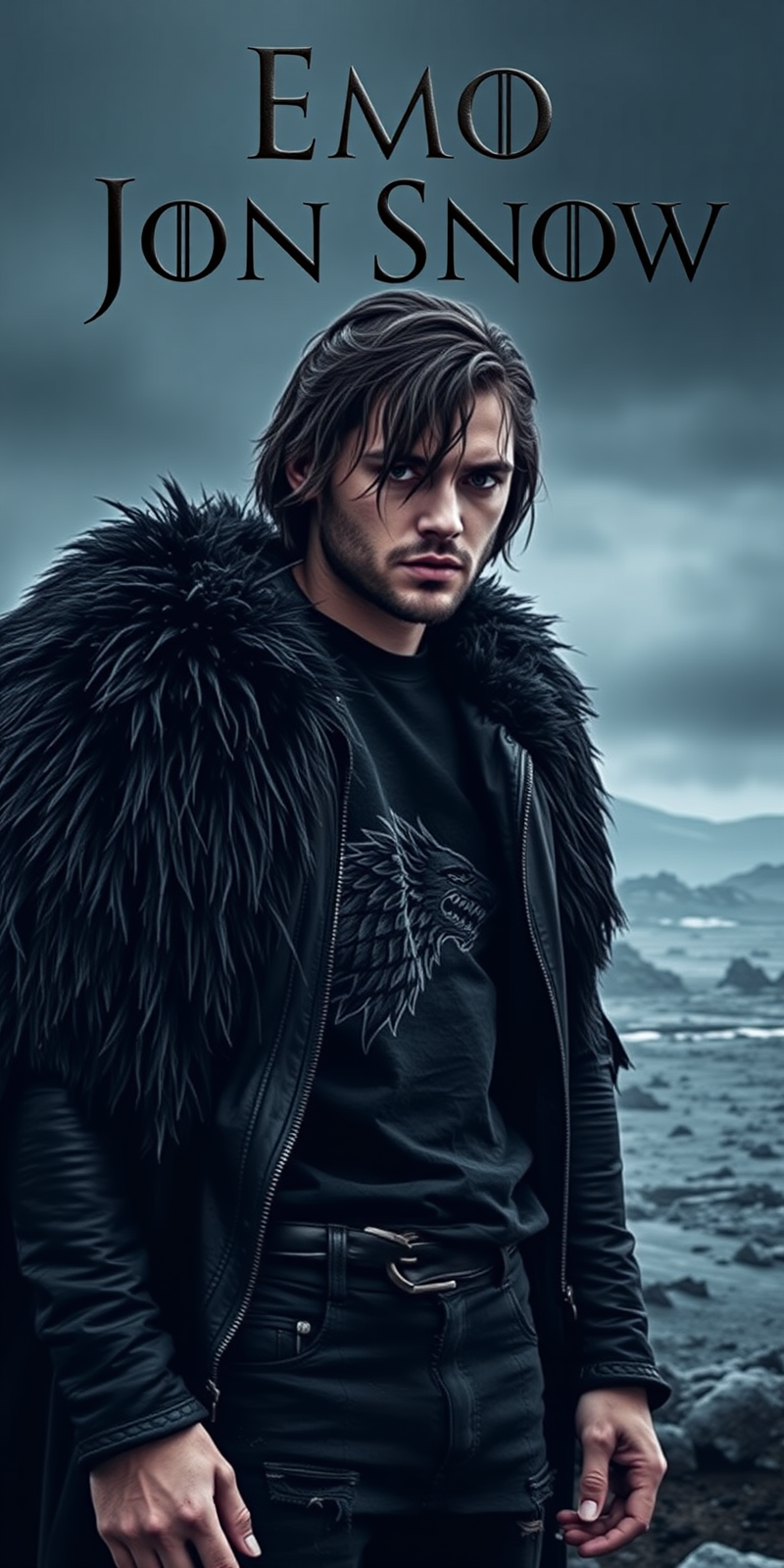 Create an image titled 'Emo Jon Snow,' featuring Jon Snow from Game of Thrones with a dramatic emo-inspired style. Jon Snow is dressed in dark, emo-style attire, including a black leather jacket over a dark, graphic t-shirt and black, distressed jeans. His iconic fur cloak is reimagined in a darker, more tattered version, enhancing the emo aesthetic. His hair is styled with a dramatic emo fringe, darkened and tousled to partially cover his face. His expression is deeply melancholic and introspective, with subtle dark eyeliner to accentuate the emo look. The background features a dim, moody version of the icy landscapes of the North, with overcast skies and a somber, atmospheric setting. At the top of the image, prominently display the title 'Emo Jon Snow' in a dramatic, emo-inspired font with jagged edges and dark, subtle accents, complementing the overall melancholic and edgy tone of the scene.