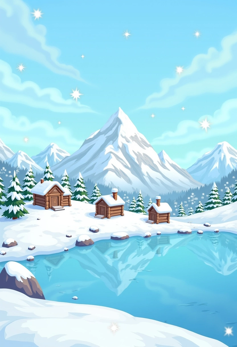 A snowy mountain peak with cozy log cabins, a frozen lake, and softly falling snowflakes, rendered in the bright, playful art style of MapleStory.