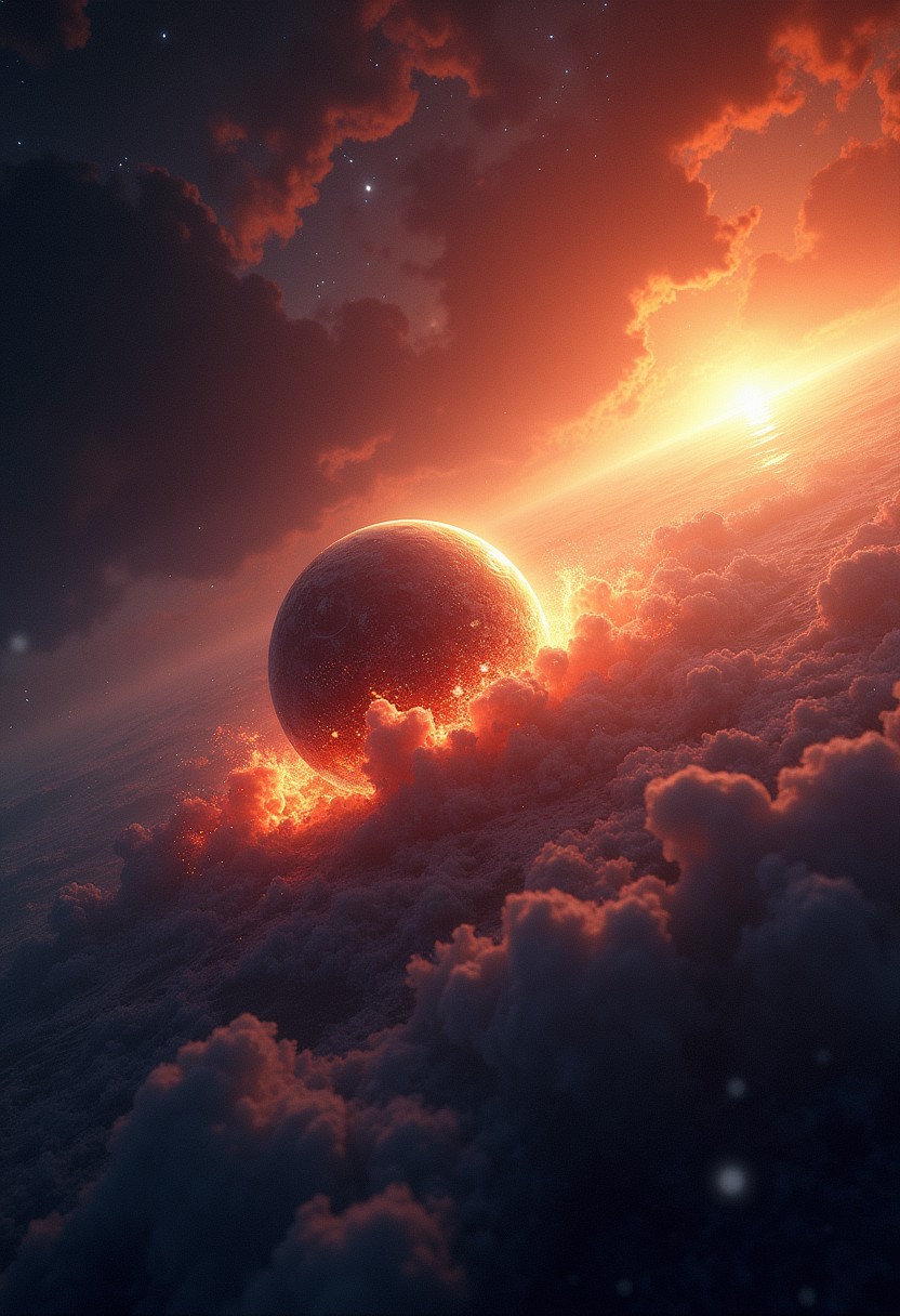 8K, hyper realism, view from Earth's high orbit, dramatic cosmic scene of a Planet Mercury hitting the ocean, aesthetic colours, fire and shockwaves,