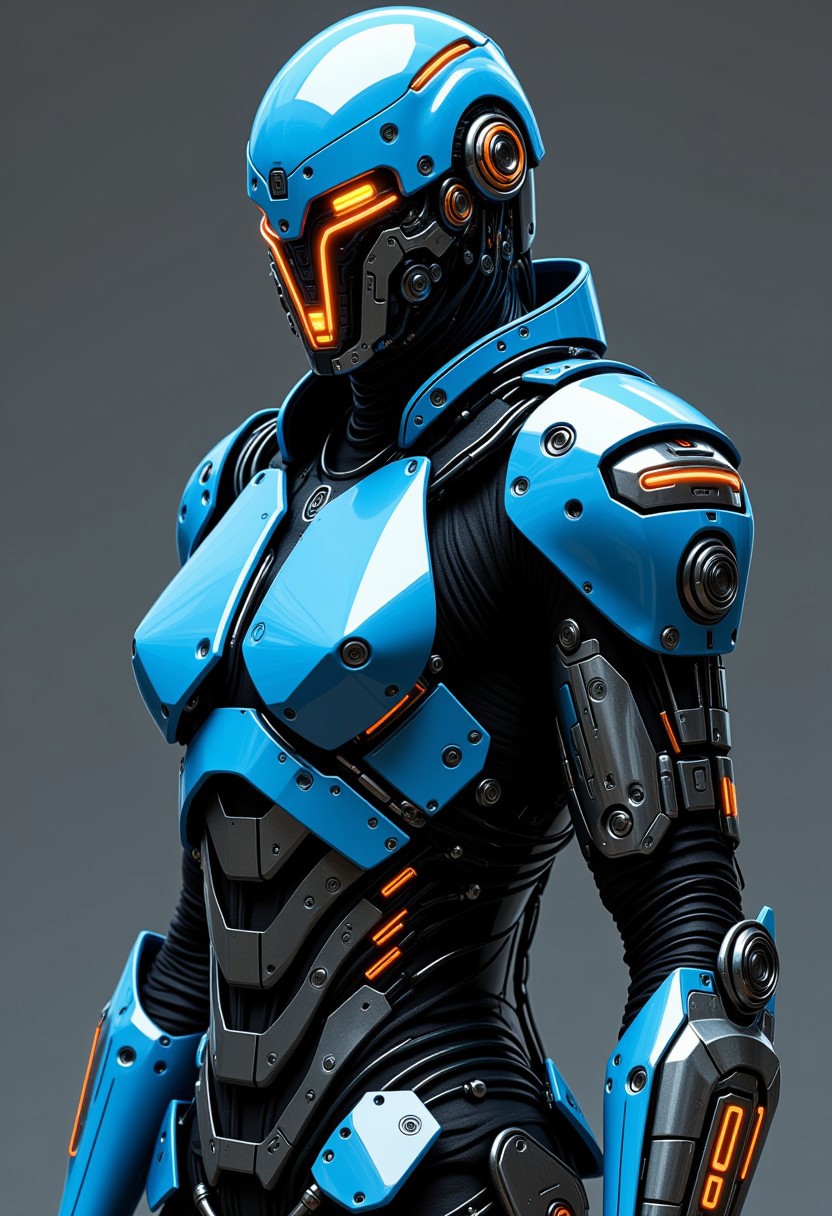 high-quality render of a cyberpunk inspired Mandalorian armor, metallic cobalt blue armor with diffused orange leds, wires and cables, exposed circuitry, concept art