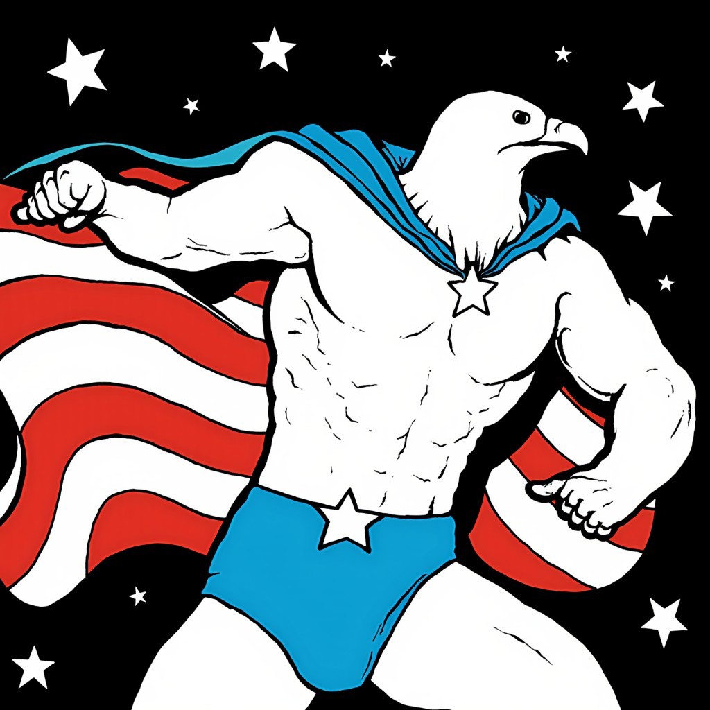 pbfstyle, eagle superhero with united states flag cape, white feather body, white skin, flexing muscles. starry background