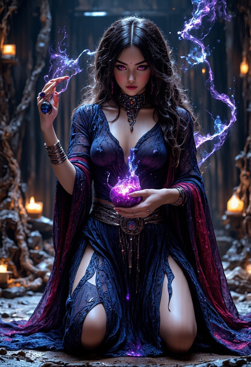 Female Dark Lord Appearance: Tall and imposing with pale, luminescent skin. Attire: Flowing gown that absorbs light, shifting from obsidian to midnight blue, adorned with silver thread and ancient runes. Hair: Cascading raven black waves with hints of deep purple, sometimes elegantly braided. Eyes: Piercing, glowing with shades of crimson and deep violet, holding secrets and danger. Accessories: Dark gemstone choker, rings of twisted metal and dark stones, long cloak lined with crimson fabric. Aura: Cold and palpable, accompanied by a whispering sound, creating an atmosphere of menace. Overall Impression: A blend of beauty and terror, exuding elegance and formidable power, a master of manipulation in a fantasy realm. Pose: Kneeling on one knee with her head bowed, one hand resting on the ground and the other raised, holding a dark crystal that glows ominously. Her hair cascades around her shoulders, creating an aura of mystery and power. Setting: An ancient altar surrounded by flickering candles and swirling shadows, emphasizing the gravity of the ritual she is performing. mythp0rt, pretty eyes, pokies, hkmagic
