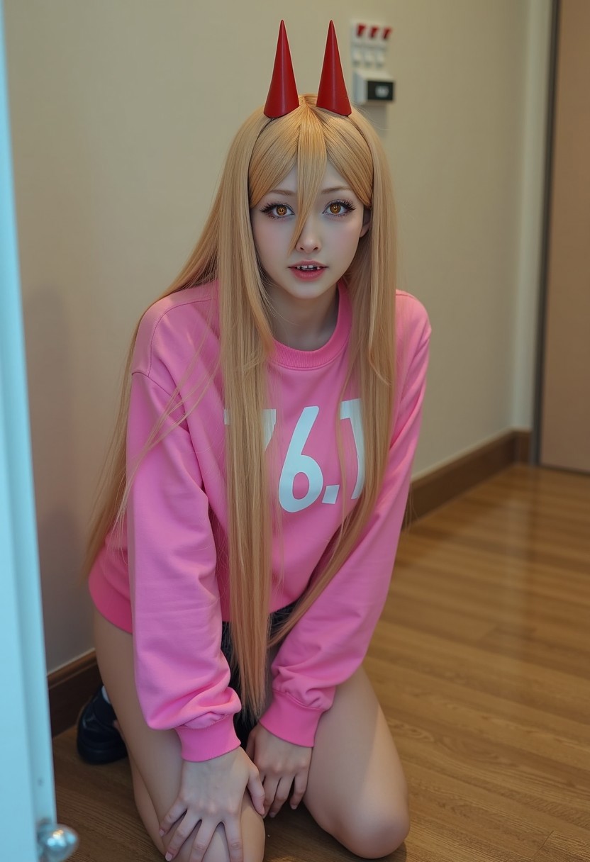 Cinematic shot, realistic photo of 19yo Power_csm kneeling on the floor of a Japanese apartment. She has cross-shaped pupils, horns, sharp jagged teeth, and long blonde hair. She's wearing shorts and a pink sweater off her shoulder that has "76.1" printed on the chest in large white letters.