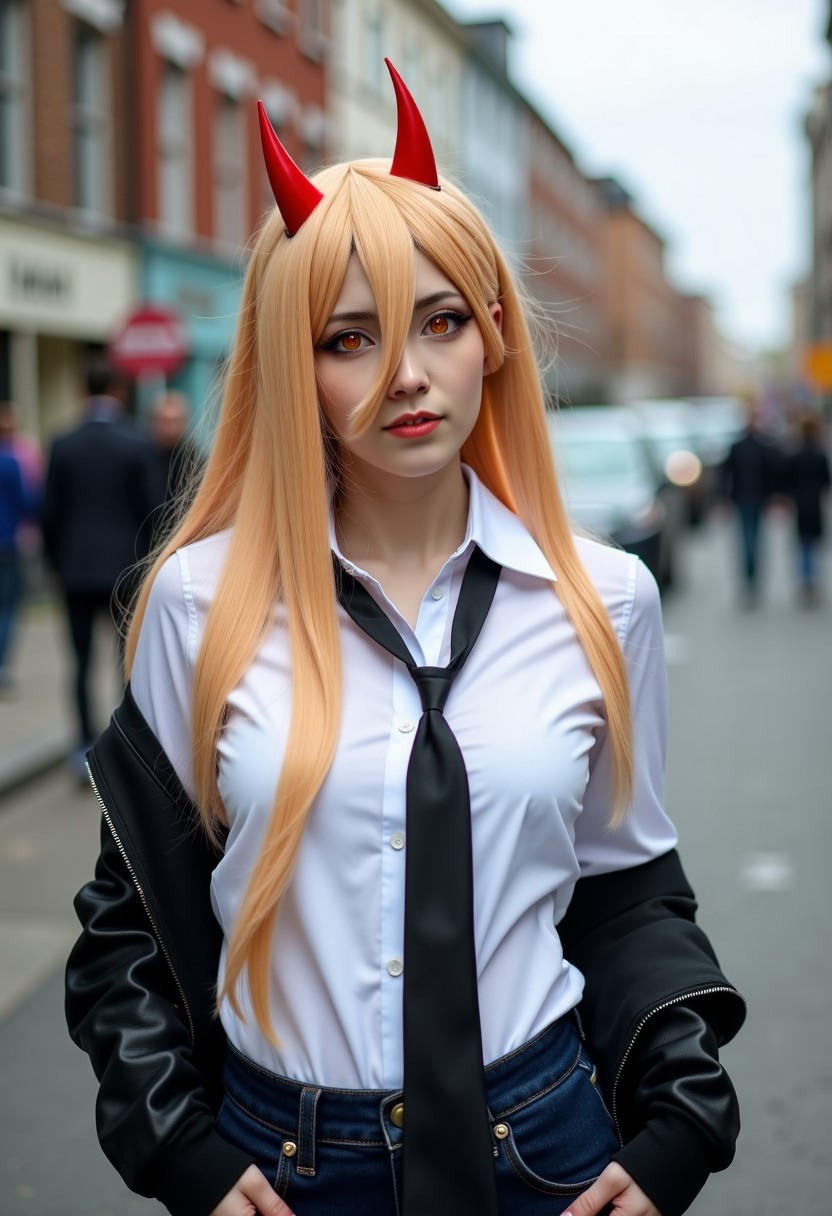 Cinematic shot, realistic photo of 19yo Power_csm confidently walking down a street. She has cross-shaped pupils, horns, sharp teeth, and long blonde hair. She's wearing an untucked white shirt, a tie, and a jacket.