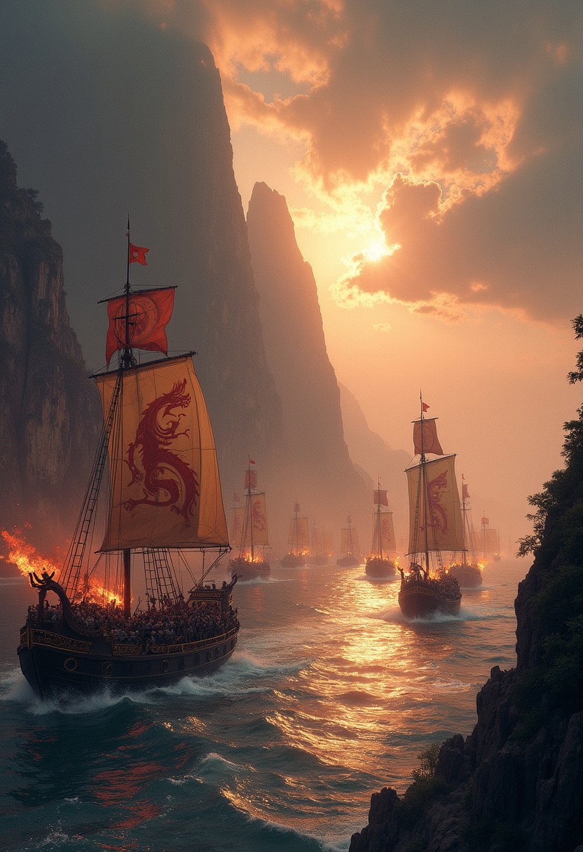 Under a tempestuous Yangtze sky, the Battle of Red Cliffs rages with epic ferocity. Cao Cao’s gargantuan fleet, adorned with dragon-emblazoned standards, advances with grim resolve. Opposing forces, led by Sun Quan and Liu Bei, counter with their own formidable armada, sails unfurled like celestial banners. The river roils with the conflagration of fire arrows and burning ships, while the ancient cliffs, silent witnesses, stand as a backdrop to Zhuge Liang's brilliant stratagems. This tableau of martial grandeur and strategic brilliance epitomizes the transient nature of power and the sublime artistry of warfare.