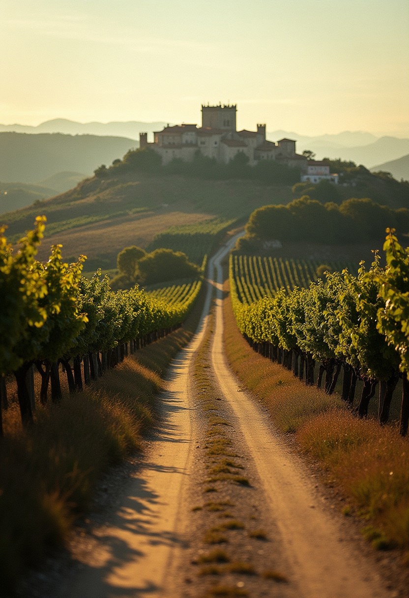 gorgeous cinematic raw photo of landscape in Sicily Italian country village road,wide angle, shot from back,dynamic lighting,a distant castle on hill top, windy road through vineyards,interplay of lights and shadow,high end, (birds eye view:1.4),shot on Sony A9 II with Sony FE 24-70mm f-2.8 GM,photo by David Burdeny, highly detailed, film grain