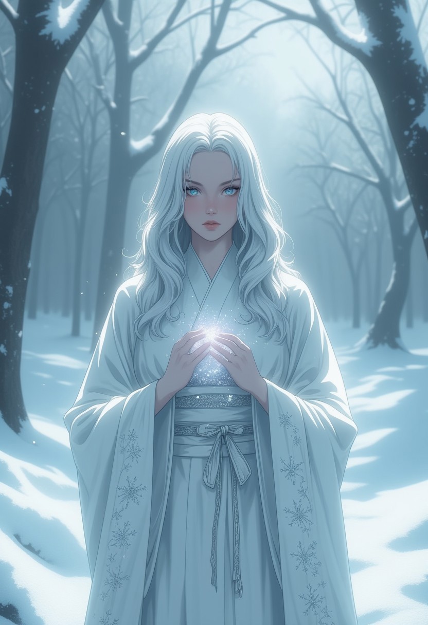 Concept art, (shot above the thighs), a hauntingly beautiful European woman with pale, almost translucent skin, and long, silver-white hair that cascades down her back like a waterfall of ice. Her piercing blue eyes are cold and mesmerizing, filled with an ancient, icy power. She wears a pure white kimono, embroidered with delicate snowflakes that seem to glisten in the light. Around her waist is a silver obi tied with an intricate knot, and her hands are held gracefully in front of her, creating a small, swirling snowstorm between her fingers. She stands in a snow-covered forest, with tall, skeletal trees encased in ice, their branches bowing under the weight of the snow. The ground is blanketed in untouched snow, sparkling under the light of a pale winter moon. The background is a frozen landscape, silent and still, with the only sound being the faint whisper of the wind. The atmosphere is chilling and ethereal, filled with the haunting beauty of the Yuki-Onna, the snow woman of Japanese folklore, with cold, icy lighting, and a mood of serene, otherworldly calm , in style of Ilya Kuvshinov