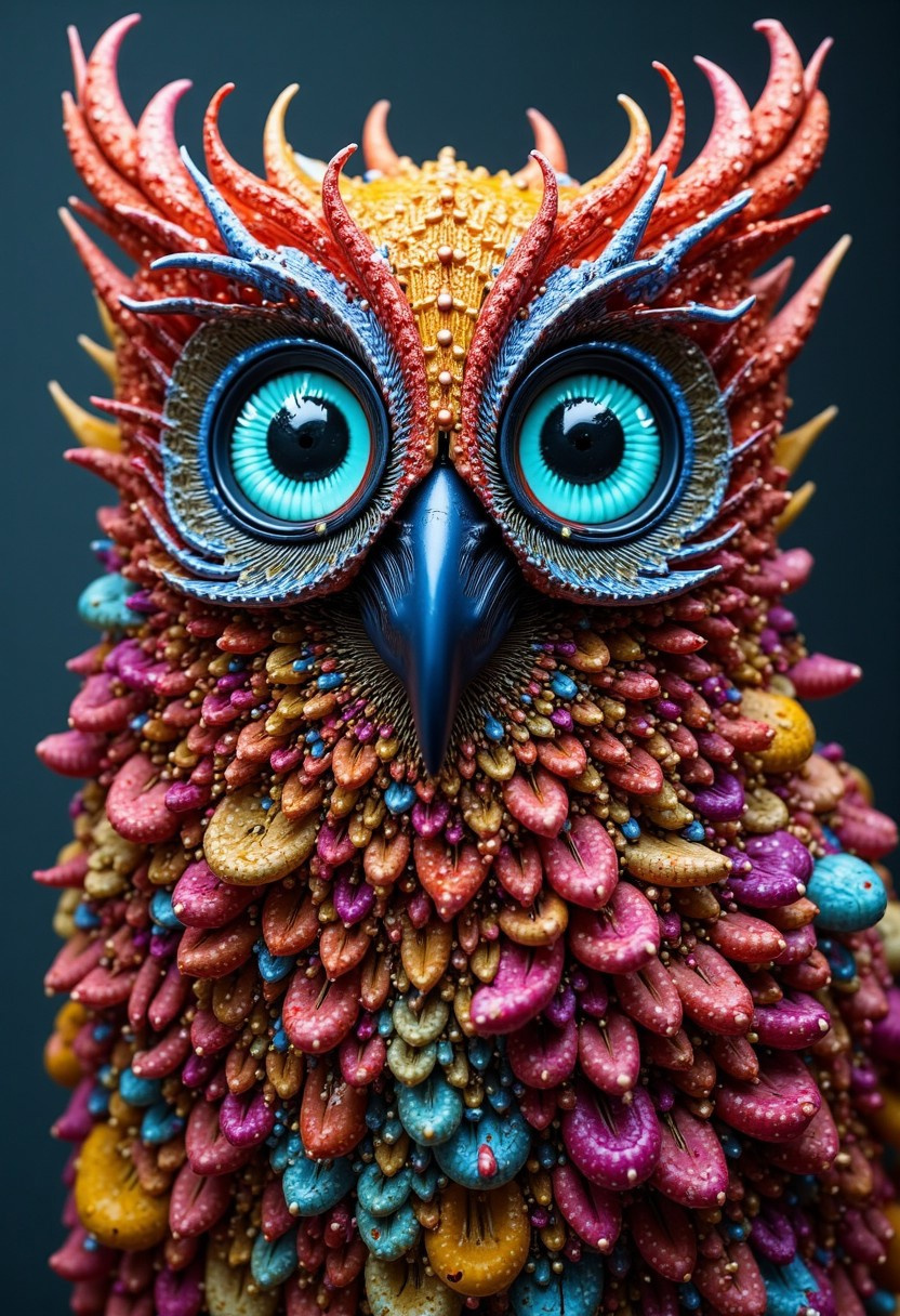 PSYCHEDELIC dramatic dynamic portrait of a fractal owl with cartoon eyes covered in intricate glowing colorful floral bioluminescent ivy filigree and glowing glass beads, chestnut scarlet canary pumpkin ivory mahogany aquamarine raspberry, in the style of Salvador Dali and Disney, 4k, cinematic lightihng