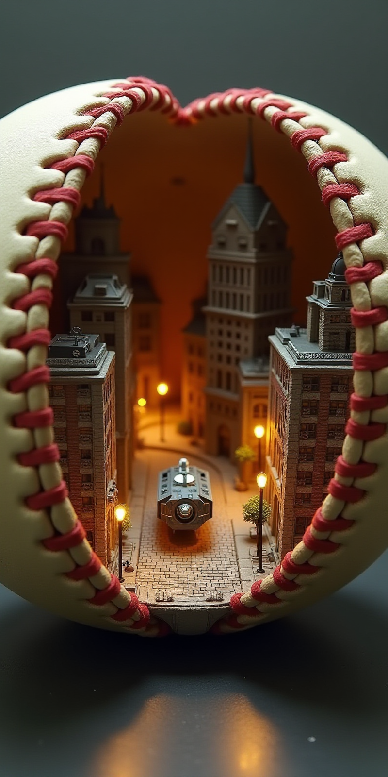 Picture a tiny, intricate model city built within the interior of a hollowed-out baseball. The city's architecture is a blend of classic and modern, with tiny brick buildings, sleek skyscrapers, and winding streets, all perfectly scaled down to fit within the curved shell of the baseball. The stitching of the baseball, now forming the horizon, creates a unique boundary around the miniature world. Streetlights flicker softly along cobblestone paths, and a tiny park with minuscule trees and benches sits in the city center. In the foreground, a futuristic vehicle hovers above the streets, casting a soft glow that illuminates the detailed facades of the buildings. The leather texture of the baseball contrasts with the city's intricate details, making the scene feel both surreal and captivating, as if this tiny world could spring to life at any moment.