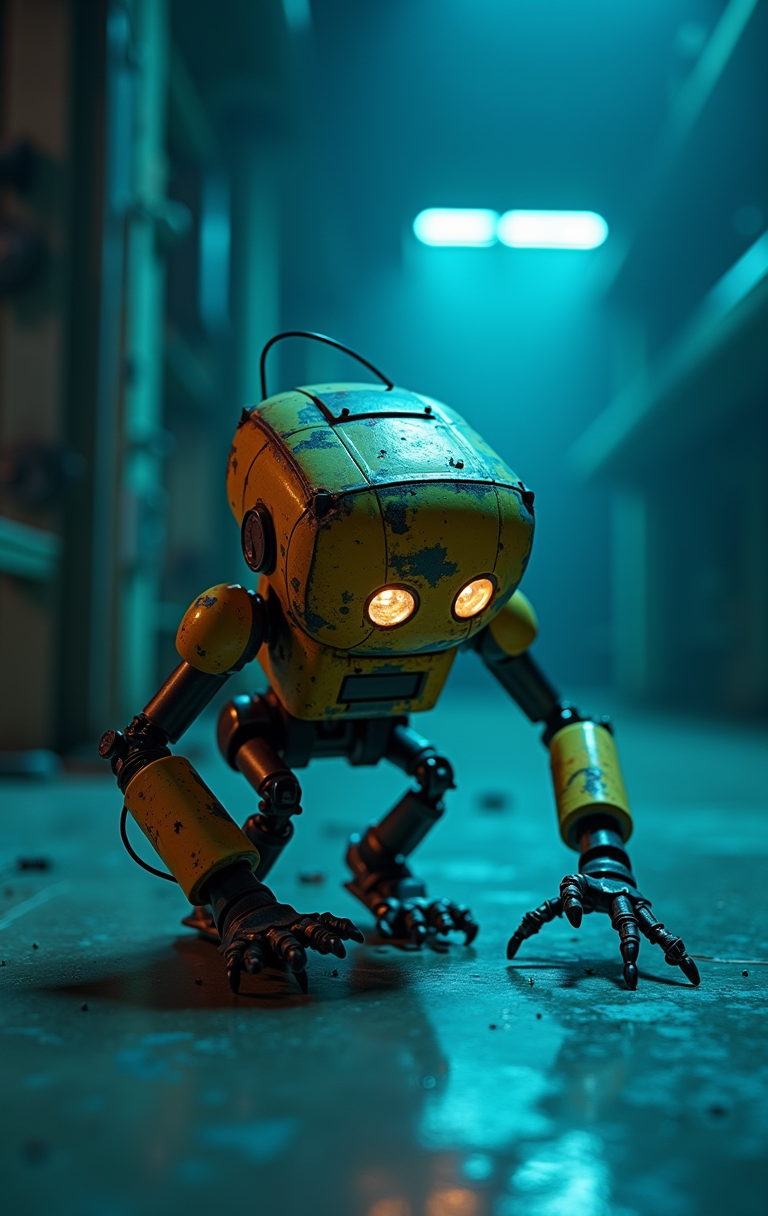 In a dimly lit, futuristic room filled with the eerie hum of machinery, a small, forlorn robot struggles to crawl across the cold, metallic floor. Its once-bright paint is now chipped and dulled, revealing patches of rusty steel beneath. Dim blue lights flicker above, casting a sorrowful glow on its contorted frame. The robot’s spindly arms, adorned with delicate wiring and a few flickering LED indicators, stretch desperately toward the viewer, each movement jerky and labored, as if it’s yearning for connection. Mechanical whirs punctuate the silence, hinting at its deep-seated loneliness. Shadows dance around it, creating an atmosphere thick with melancholy. The faint scent of warm metal lingers in the air, amplifying a sense of desolation, as the robot’s optical sensors blink with fading hope, reflecting a poignant longing for understanding in a bleak, abandoned world.