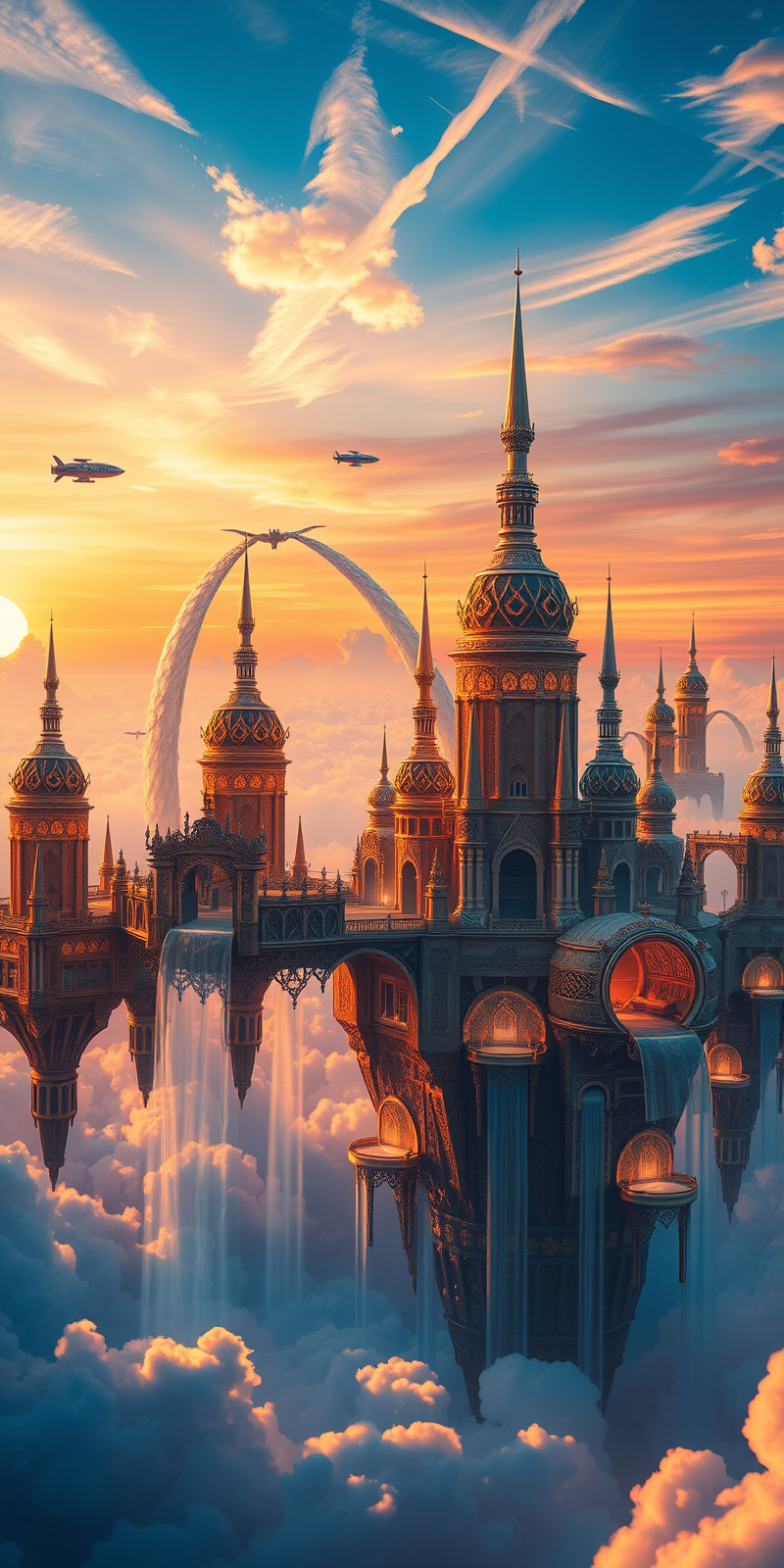 Create an awe-inspiring masterpiece depicting a majestic floating city in the sky during a golden hour. Imagine a breathtaking cityscape suspended among the clouds, with intricate, luminous architecture that seems to defy gravity. The buildings, adorned with intricate patterns of gold and crystal, gleam as they catch the warm, golden light of the setting sun. Cascading waterfalls flow from floating platforms into clouds below, creating a mesmerizing mist that reflects the sunlight in dazzling rainbows. Airships and winged creatures glide gracefully between the towers, adding a sense of serene motion to the scene. The sky above is a canvas of vibrant oranges, pinks, and purples, with wisps of cotton candy clouds adding to the ethereal quality. This stunning vista is designed to captivate viewers, leaving them spellbound by the beauty and grandeur of the floating city.