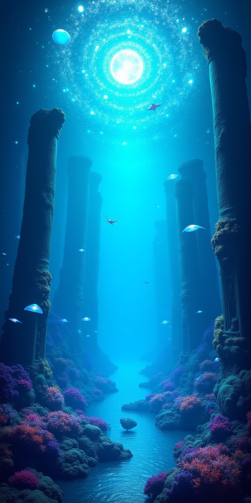Craft a visually breathtaking masterpiece set in an otherworldly underwater realm. Picture a colossal, bioluminescent coral reef that stretches endlessly across the ocean floor, bathed in a deep, twilight blue. Giant, glowing sea creatures, like ethereal jellyfish and majestic manta rays, drift gracefully among the vibrant corals, their lights casting an enchanting glow over the scene. Enormous, ancient underwater columns, encrusted with shimmering pearls and gems, rise from the ocean floor, creating a grand, cathedral-like atmosphere. Above, a network of floating, translucent bubbles forms a celestial dome, capturing and refracting light from a distant, mysterious sun filtering through the water. The entire environment is painted in rich, iridescent hues of teal, violet, and turquoise, designed to leave viewers in awe of the fantastical beauty and serenity of this magical underwater world.