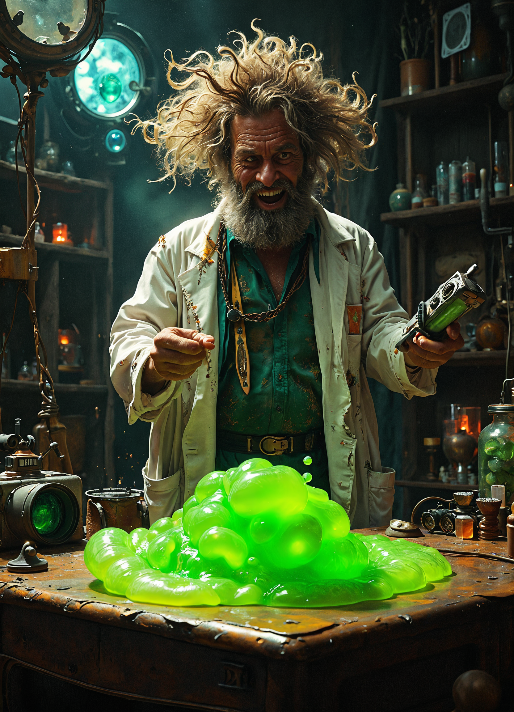 Hyper-realistic surrealist scene: A wild-haired mad scientist in a singed lab coat stands triumphantly beside a small, wobbling pool of fluorescent green jello. The scientist's laboratory is a chaotic mix of steampunk-inspired gadgets and bubbling beakers, with the jello pool incongruously placed atop an antique wooden desk. The scientist clutches a oversized remote control, a manic grin spreading across his face. Hyper-detailed textures capture every hair, bubble, and jiggle, creating a absurd blend of the realistic and the impossible.