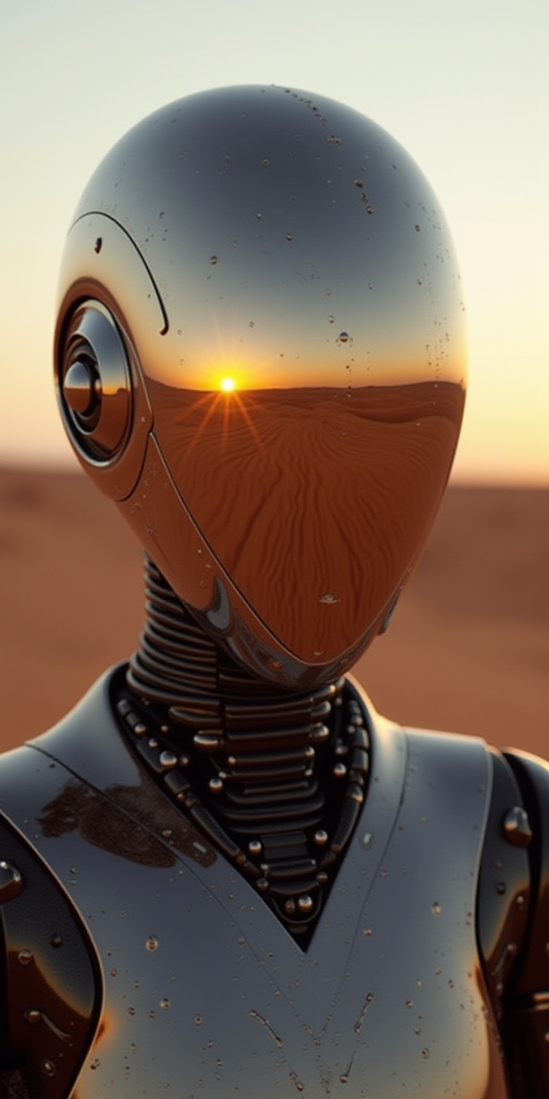 mythp0rt, view of the reflection of the landscape on the faceplate of a perfectly reflective robot in desert landscape at sunset, perfect lighting, perfect composition