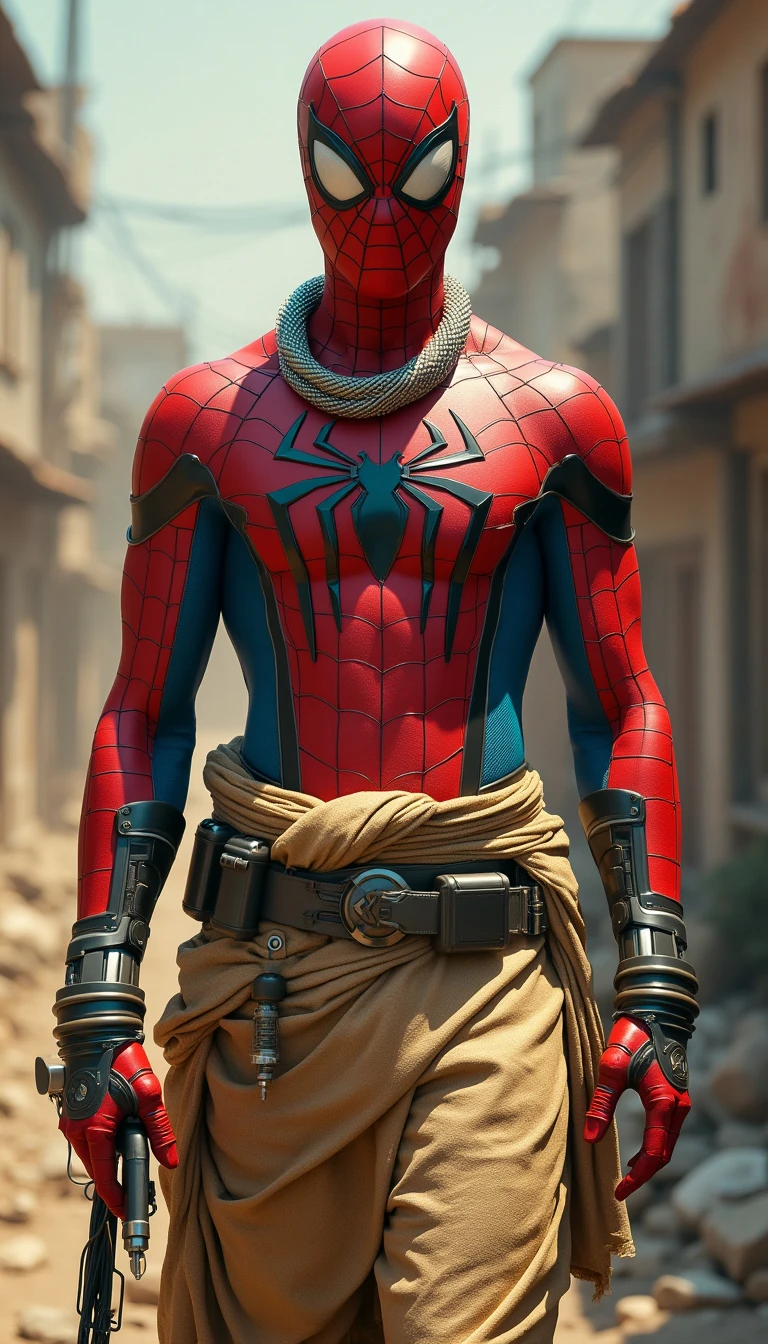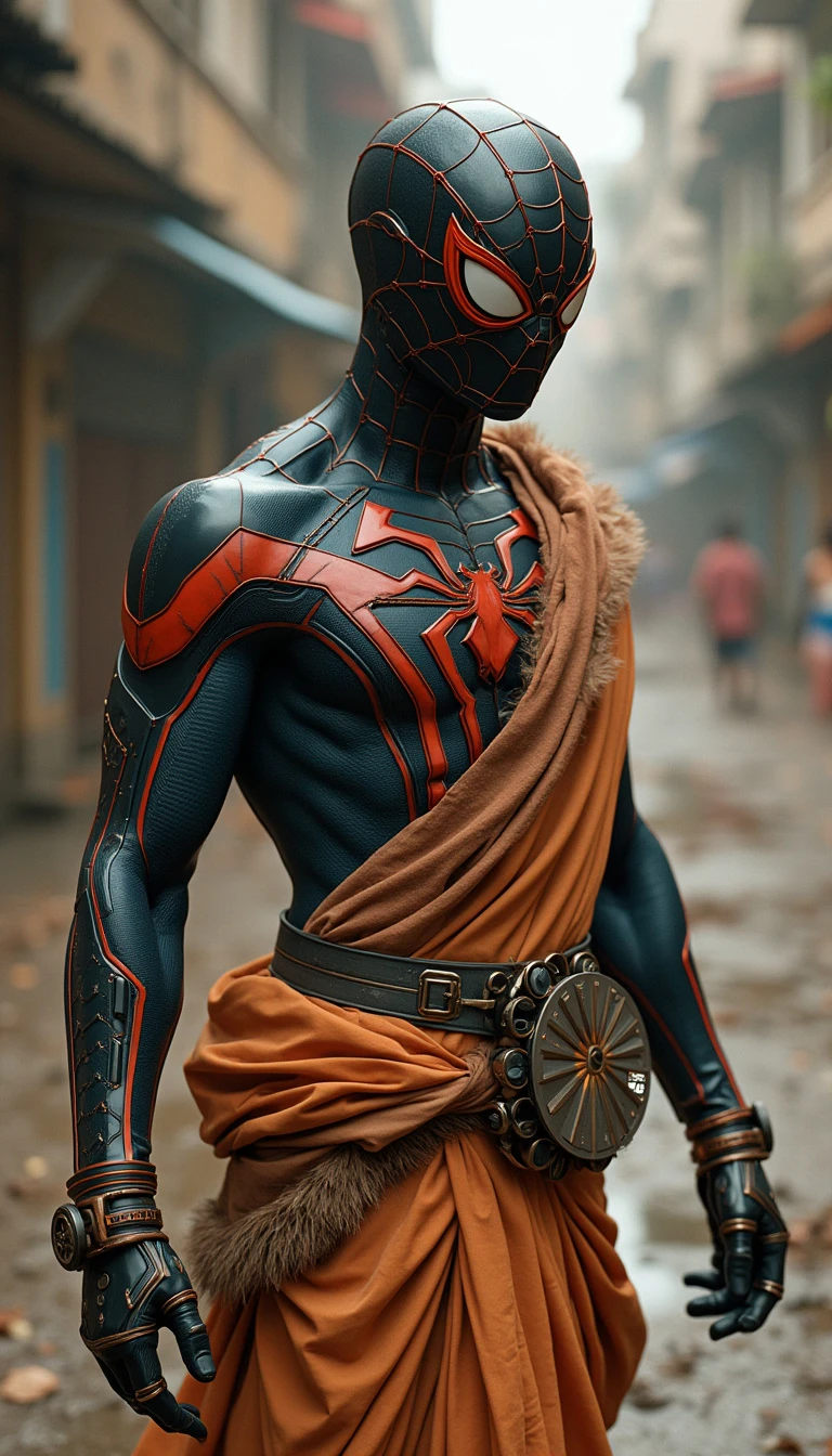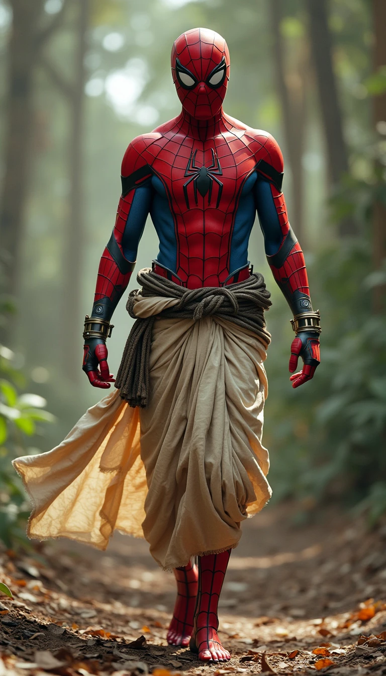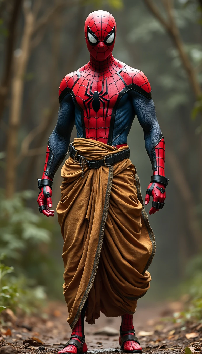 A hyper realistic Spider man in advanced futuristic suit wearing a dhoti kerala style, intricate detail cinematic
