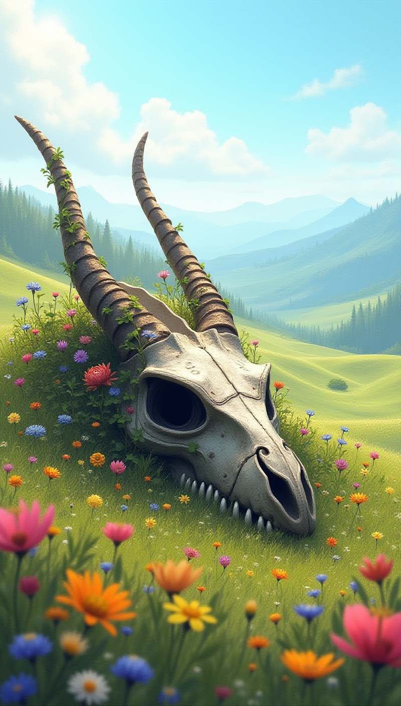 In a serene sunlit meadow filled with vibrant wildflowers, a massive dragon skull lies partially buried, the skull's formidable horns stretch upward, adorned with climbing vines and blooming flowers, The intricate details of the skullas structure with large hollow eye sockets and sharp teeth, The soft hills and distant mountains under a clear blue sky provide a peaceful backdrop