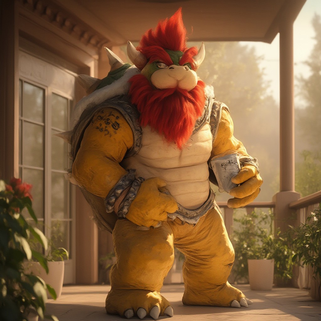 A photo of a realistic Bowser (Koopa) turtle standing on the front porch in the morning with a red beard. Tall, broad muscular shoulders, wearing pajama pants, holding a coffee mug. Photorealistic details. Fluffy hair and eyebrows with stray hairs.
