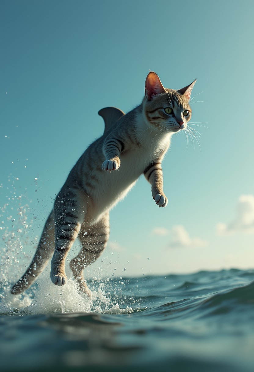 A cross between a cat and a shark, shark body, cat head, jumping out of the ocean, surrealism, action scene, cinematic feel, perfect textures, tilt-shift effect.
