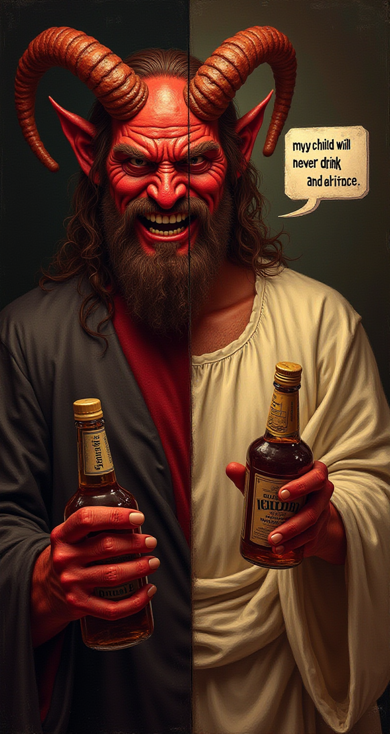A two panel image split diagonally. On the top left panel there is a smiling face of a horrible horned red demon (satan) with his mouth open. A speech bubble with letters spelling out "my child will never drink and drive". On the bottom right panel is the kind face of Jesus, handing the viewer a bottle of whiskey and a set of car keys 4k, masterpiece, make the text legible.
