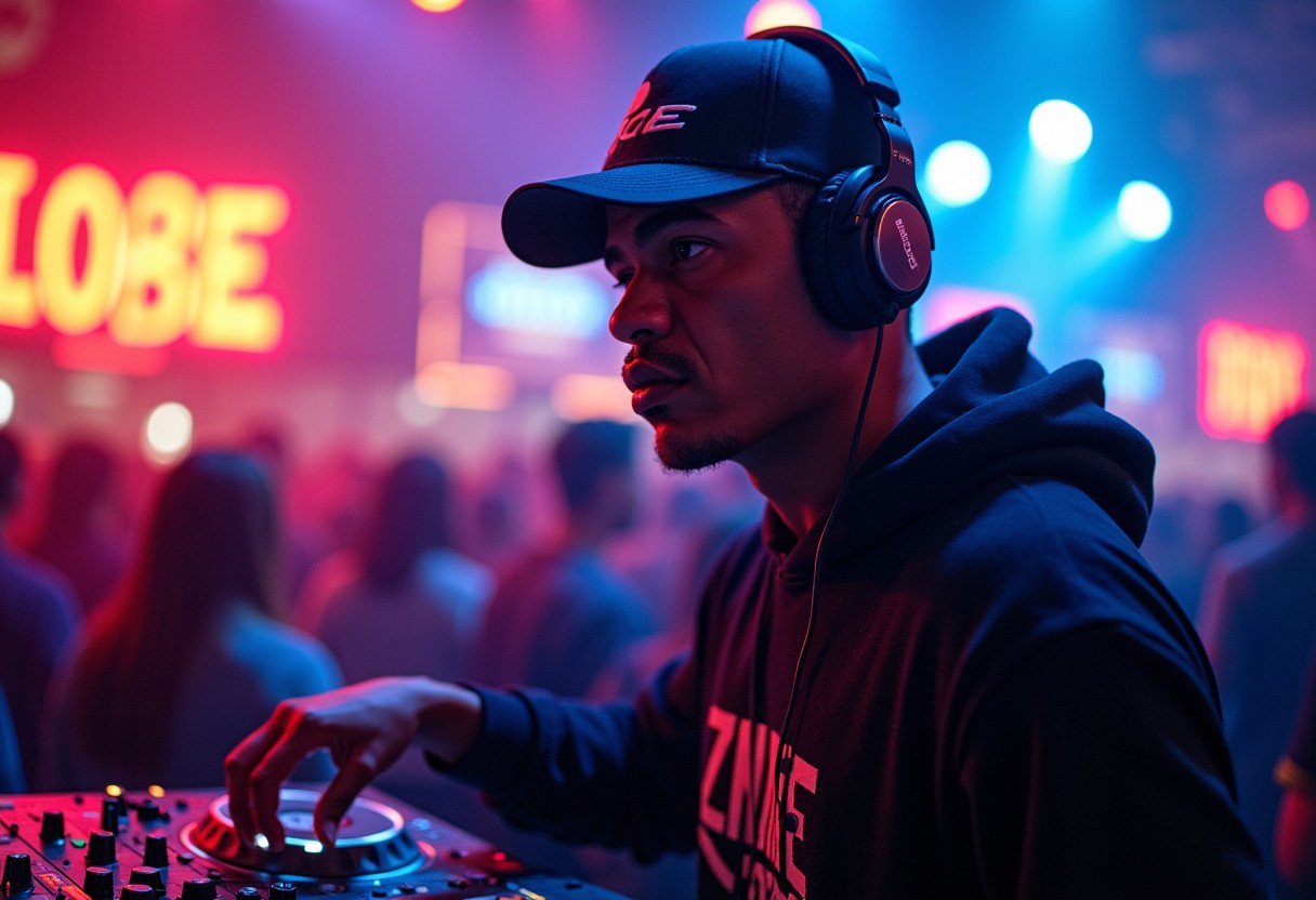 @carlosmanuelpe2 (79) "A DJ performing at an electronic music party, seamlessly blending urban hip-hop style elements with vibrant, eye-catching colors. The DJ is wearing a stylish cap turned slightly to the side and a pair of sleek headphones. His intense focus is on the DJ console in front of him, his hands skillfully mixing tracks. The background is alive with flashing lights and a dynamic crowd, capturing the energy and excitement of the party. The scene is filled with elements of urban street culture, like graffiti art and neon signs, adding to the vibe of the music and the atmosphere."