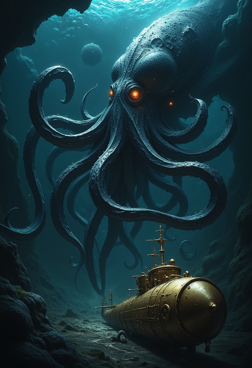 ArsMJStyle, dnddarkestfantasy, masterpiece, photorealistic image of a giant squid fighting a brass steampunk submarine at the ocean floor, dark, illuminated by searchlight of submarine, RAW photo, highly detailed
