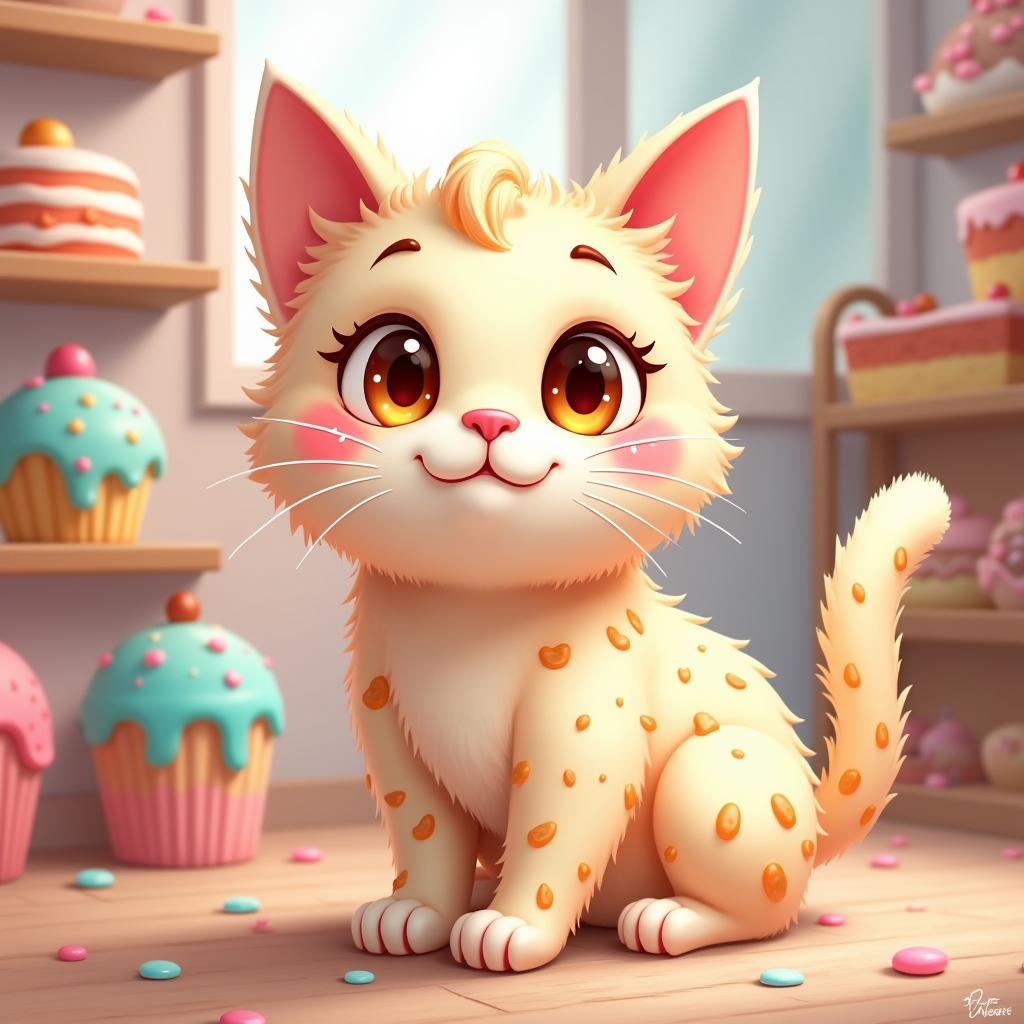 a whimsical digital illustration of a cat designed to look like a delicious, edible treat. The cat has a charmingly playful expression, and its fur is textured and colored to resemble various sweet treats—think frosting, sprinkles, and caramel drizzles. The cat's body is a soft, pastel color, like a cake or confectionery, with its ears and whiskers styled to mimic candy decorations. Its eyes are bright and inviting, resembling shiny candies or fruit jelly. The background should enhance the edible theme, with a setting that includes a bakery or candy shop, complete with colorful pastries, cakes, and sweets. The overall scene should be bright, cheerful, and deliciously appealing, capturing the essence of a cute, treat-inspired cat in a fun, imaginative way.