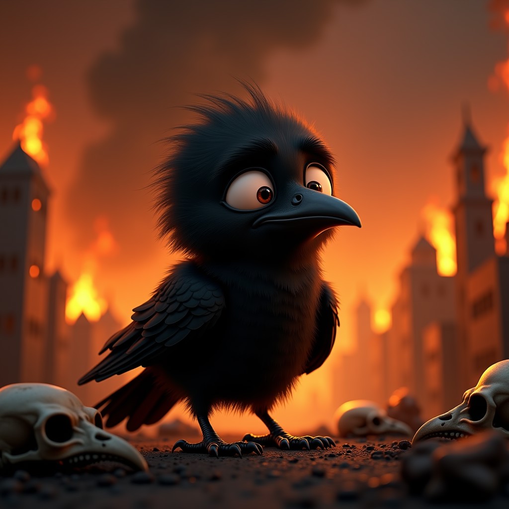 a black baby crow in pixar style with sad face, crying, city burning in the background. fire and flames, the city is devastated, rubble, bird skulls.