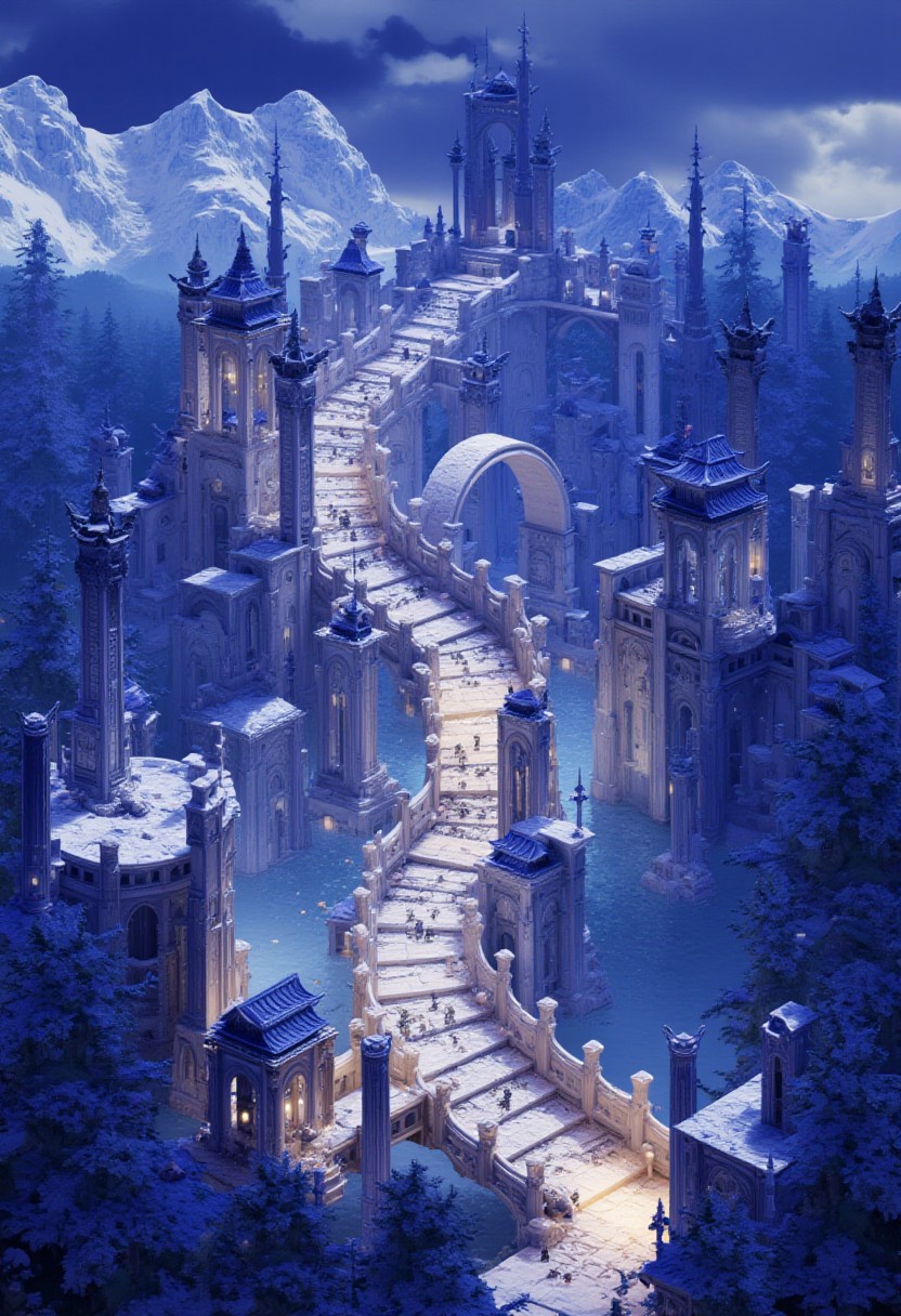 8trang microarchitecture, abstract from above, blue and white Ceramics a caravan of travelers proceeds along a stone road set with a series of ancient stone archways leading upward from a forested glade into the foothills of a mountainous realm of jagged peaks and stony pillars, small stone shrines line the road between archways, clear skies with dark clouds on the distant horizon, very detailed: 1.5 eroticism. ink splashes, rough ink sketch, moody, gloomy, dark picture, high contrast, stylized