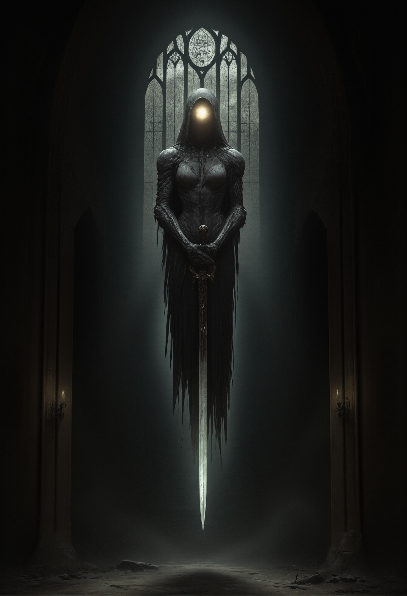 art by Ben Templesmith and hr giger, Fantasy painting of a spectral figure with a long, tattered robe, floating through the air. The ghost is illuminated with a faint beige glow, casting an eerie, ethereal light. Its robe is shredded and flowing, giving a ghostly appearance, and it holds a broken longsword, the blade fractured and jagged. The ghostâs face is shadowy and indistinct, enhancing the haunting effect. The background features a dark, gothic cathedral with towering arches and stained glass windows, shrouded in shadows. The scene is rendered in cel shading, with a dark fantasy aesthetic. The overall mood is ominous and mysterious, highlighting the ancient and worn aspects of the ghost and its surroundings. <lora:- Flux1 - vanta_black_V1.0.safetensors:1.0>, <lora:aidmaImageUpgrader-FLUX-V0.1.safetensors:1.0>, detailmaximizer <lora:Dever_Flux_Enhancer.safetensors:1.0>, dev <lora:FluxFantasyKnightsV1.safetensors:1.0>, hkstyle
