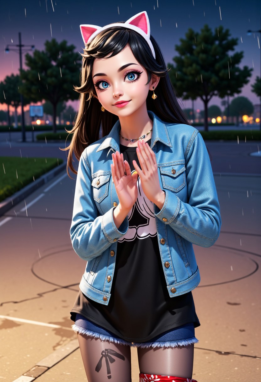 rain, night, wet clothes, 2d anime, g1ng3r, chocker, black long hair. White and pink cat ears headband, view from above, upper body shot, focus on face, wearing blue jeans jacket, black shirt, blue shorts, clapping hands, pantyhose and red bandana on her leg, she is a short stature, blue eyes, slight smile, background is a night empty basketball court,