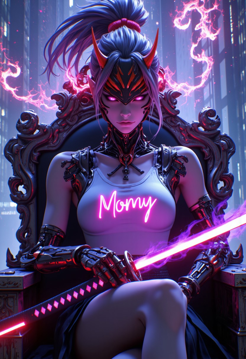 A cinematic shot of a beautiful female cyborg shogun samurai, wearing white tank top with pink text "Momy", samurai helmet, samurai shoulders, robotic arms, robotic legs, red samurai, beautiful, sexy, alluring, fit, holding a purple glowing katana in his lap, purple fire around the katana blade, cyberpunk era, Sitting on a throne on the top most floor of the tallest skyscraper. Glass floor, glass window. Entire futuristic cyberpunk skyline must be visible. Neon colours and lighting everywhere. Every element of the photo must be cyberpunk related. Impactful atmosphere in 8k resolution with intricate skin texturing, Ultrarealistic, absurdres, colorful, wallpaper, best quality, amazing details