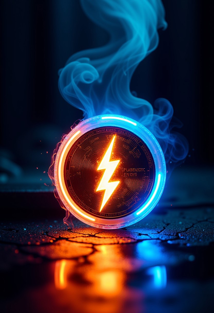 A coin in the center, a lightning emoji in the center of the coin, a dark atmosphere around, the ring is two colors bright orange and bright blue, the coin is emitting light underneath in the two colors, the ground is wet. stylish Text above "What am i?"