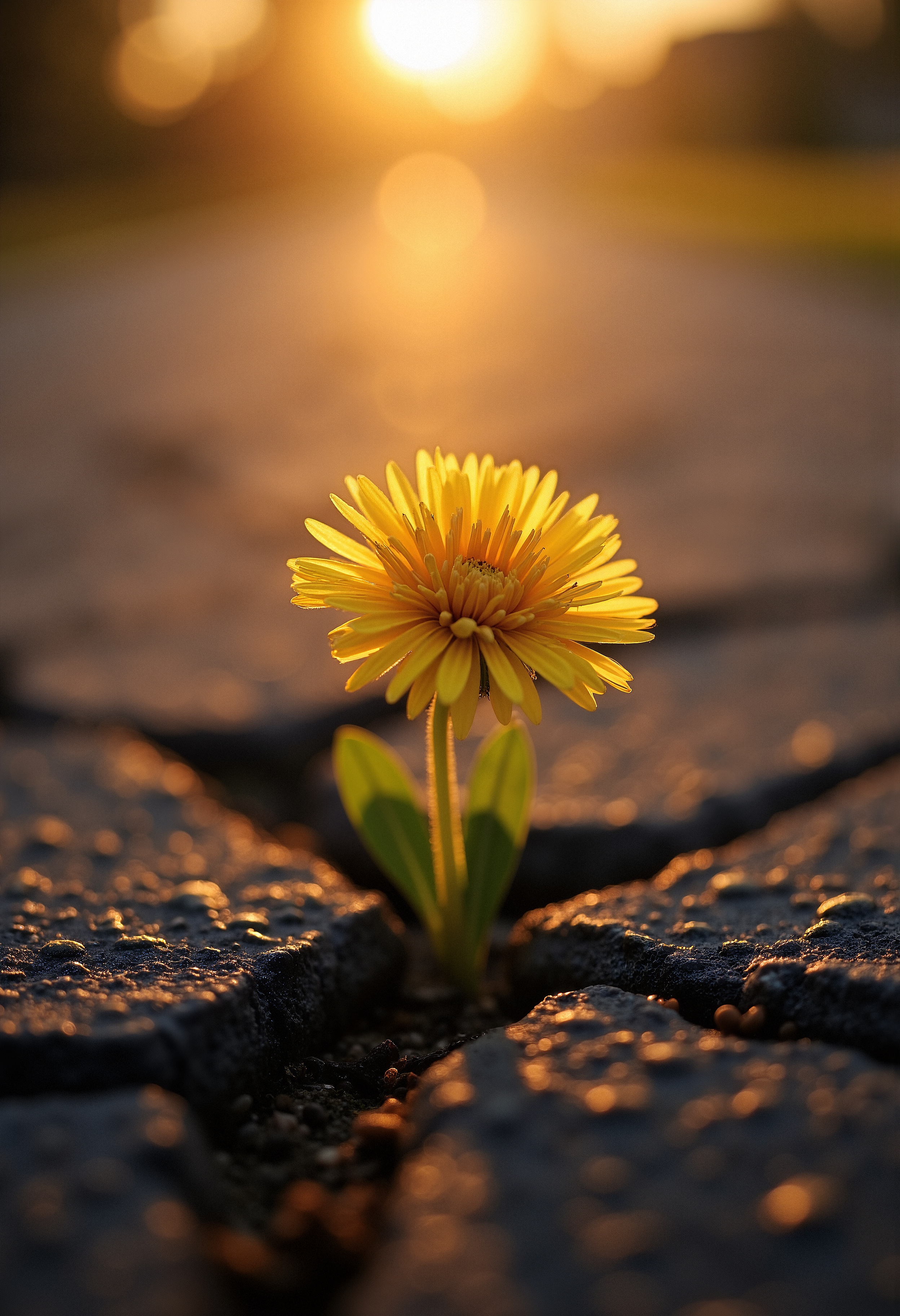 A close-up shot of a single dandelion pushing through a cracked asphalt road. The small flower stands resilient, its soft, yellow petals glowing warmly in the gentle, golden light of a setting sun. The focus is sharp on the dandelion, with the rough texture of the asphalt visible in the foreground, emphasizing the contrast between nature and the urban environment. The atmosphere is calm and peaceful, with a sense of quiet perseverance. Soft shadows fall around the dandelion, adding depth to the scene. lora:FluxDFaeTasticDetails:0.8> <lora:aidmaImageUpgrader-FLUX-V0.1:0.33> detailmaximizer, <lora:Sinfully_Stylish_.02_for_FLUX-000002:0.4>